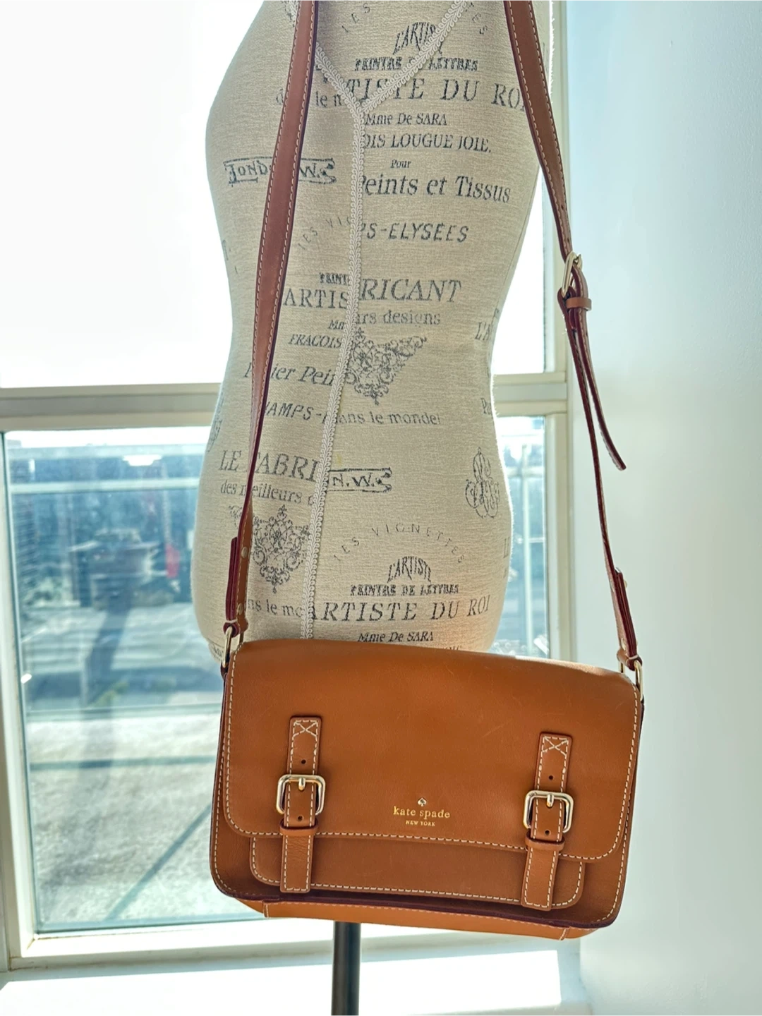 Kate Spade leather satchel in great condition with some scratches. It's a beautiful tan colour, perfect for the fall. You could wear it crossbody or in the shoulder. Comes with a dust bag for storage.