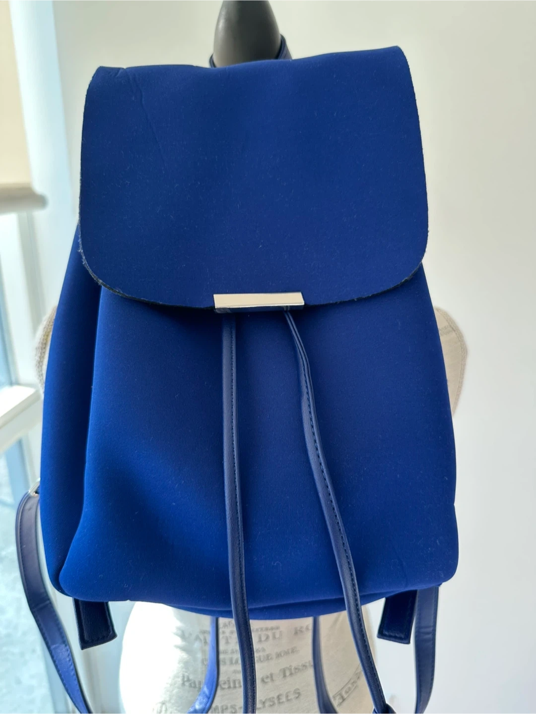 An eye catching royal blue backpack perfect for every outfit. It's in great condition and ready for a new home. The bag is quite spacious and it has a faux leather tie to keep its shape.