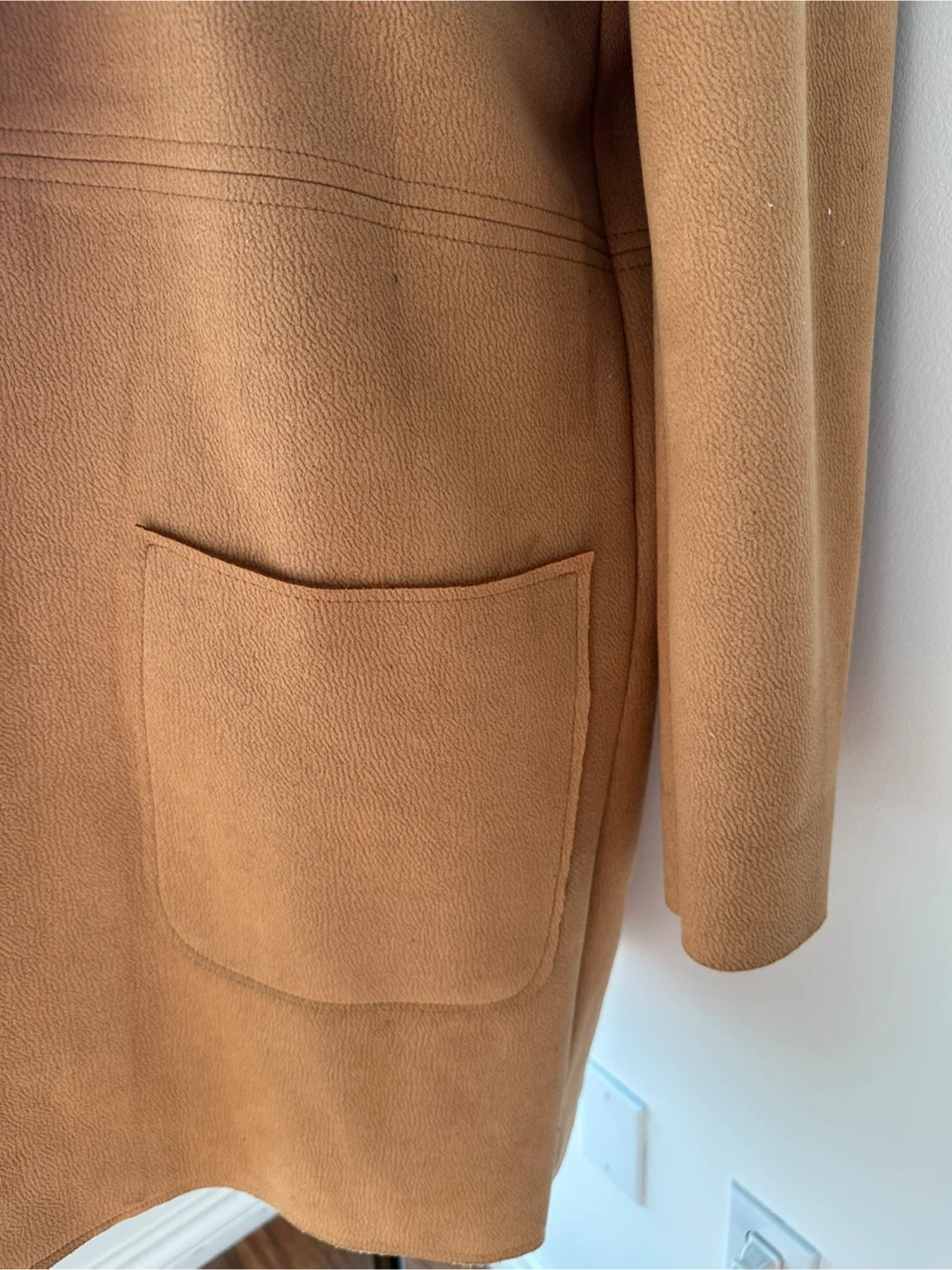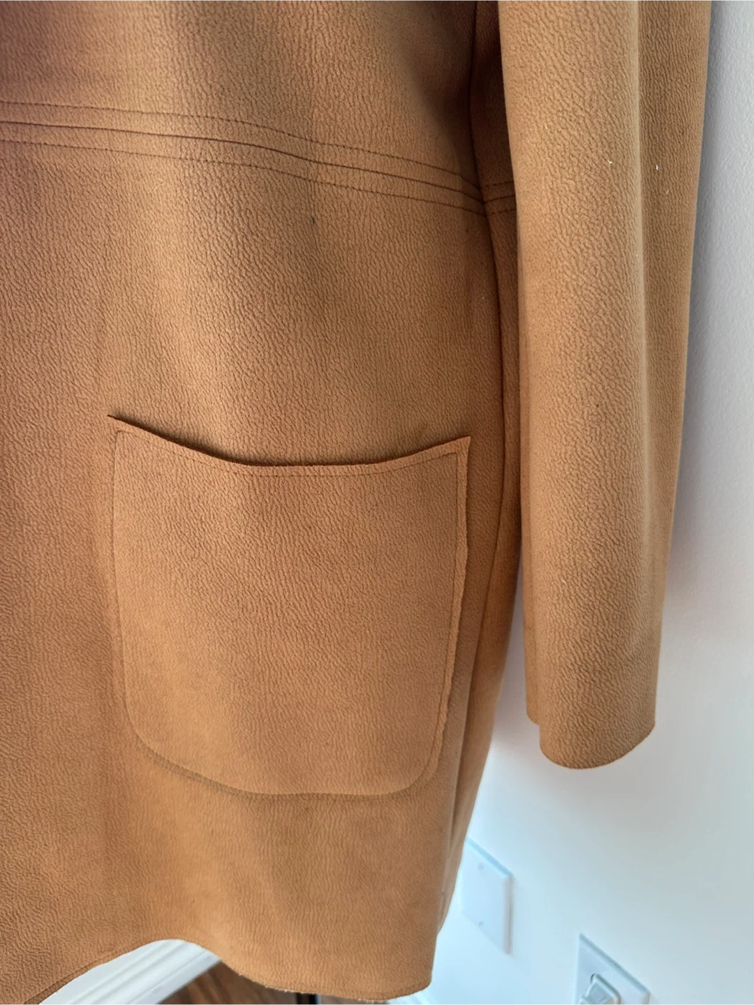 Selling a Zara tan jacket in size small. Done in faux suede it is very flattering on the body. It's in great condition and ready for a new home! The jacket has a stylish, relaxed fit with convenient pockets. Perfect for layering or wearing on its own.