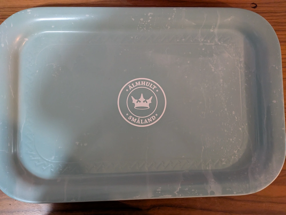 Selling a light blue serving tray with the Älmhult Småland logo. It's perfect for serving snacks or drinks. It has some signs of use, but is still in good condition for everyday use