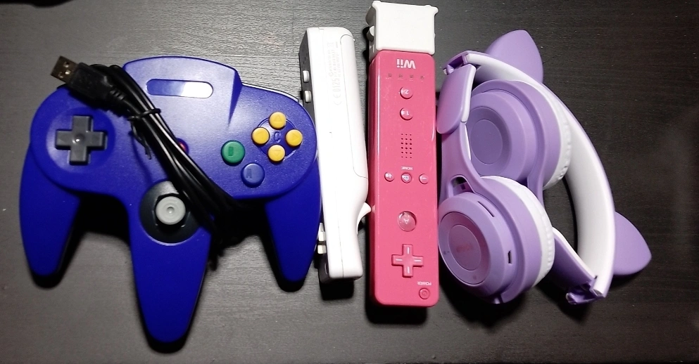 Nintendo 64 Controller, Wii Remotes, & Purple Headphones