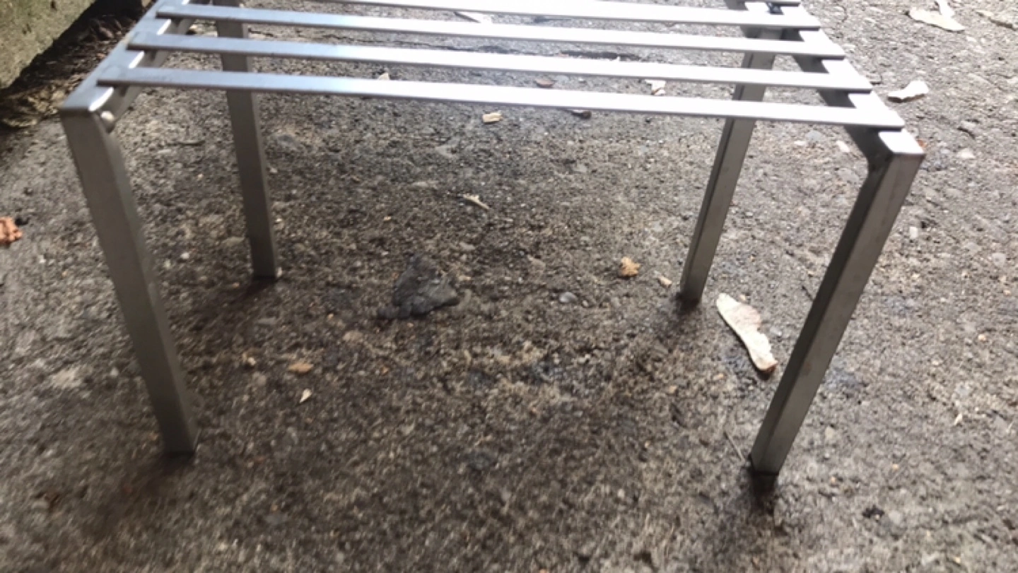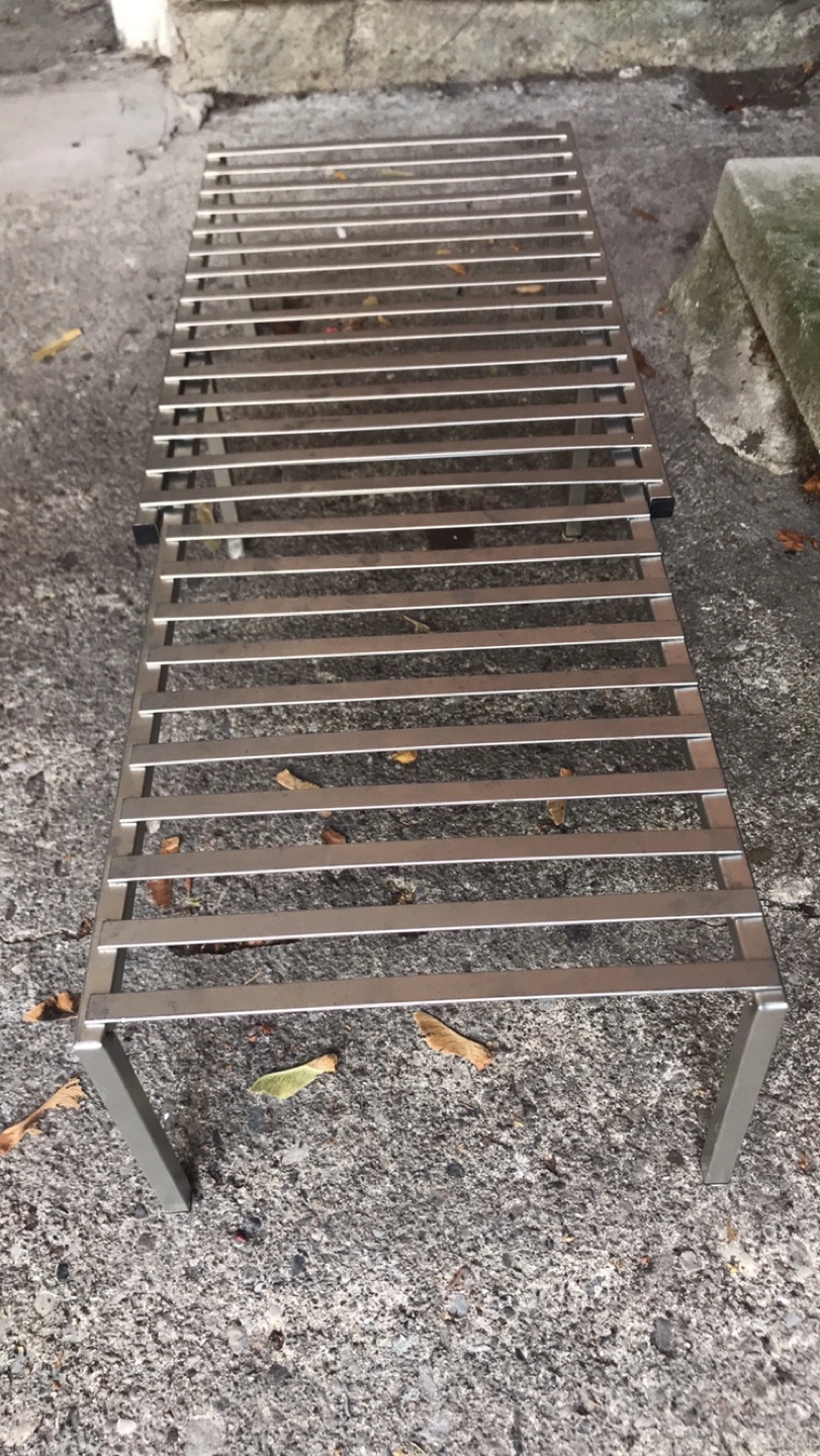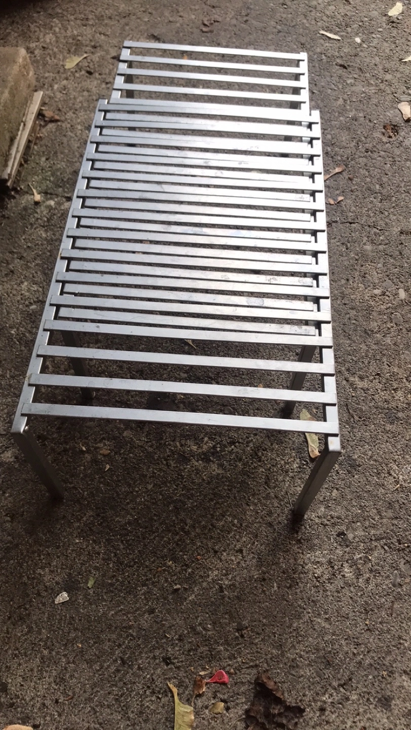 Adjustable shelves. Stainless steel two shelves that join together to make it wider. Perfect for inside a cabinet or closet to have two tiers. Height is 5 1/3 inches. Depth is 8 1/2 inches Each shelf is 15 1/2 inches. Pick up location is 10 Alcorn Avenue M4V1E4