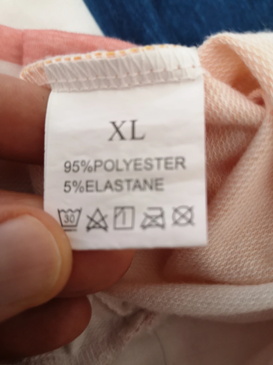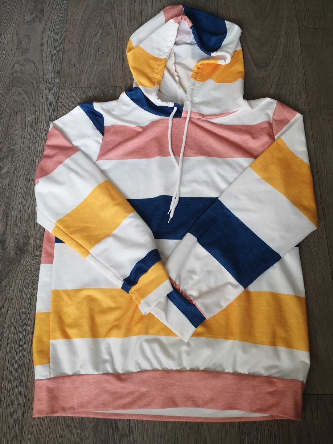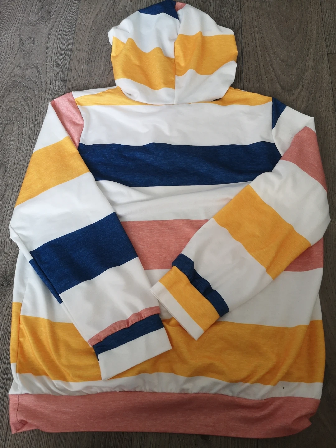 Here's a comfy striped hoodie! It's a size XL and made of 95% polyester and 5% elastane. The stripes are in colours white, yellow, blue, and peach.