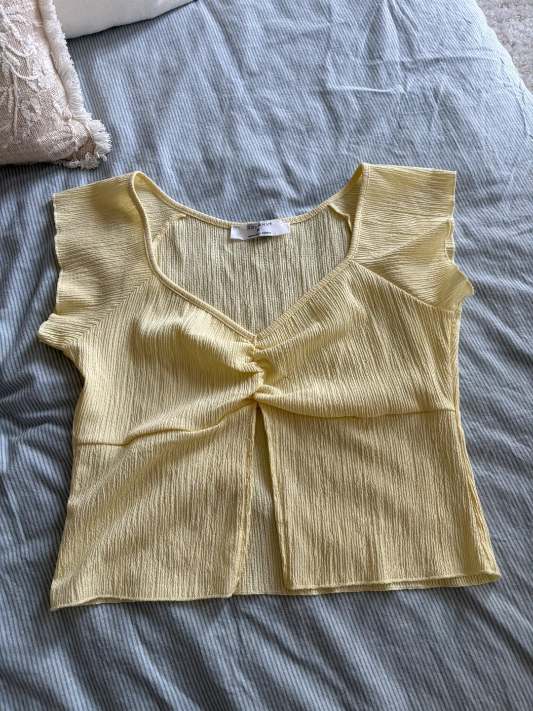 This is a cute yellow top from Primark! It features a twist front design that adds a stylish touch. Perfect for a sunny day out or a casual gathering
