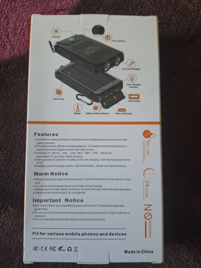 Selling a Onicec Compass Solar Power Bank. It's perfect for camping or emergencies! It features a compass, solar panel, and a dual LED flashlight. It's suitable for nearly all kinds of mobile phones and digital products which have USB cable connector. It can charge i-phone, i-pad, I-pod, Mp3, Mp4, GPS, cell phone. It's 10,000 mAh. π 2 available π