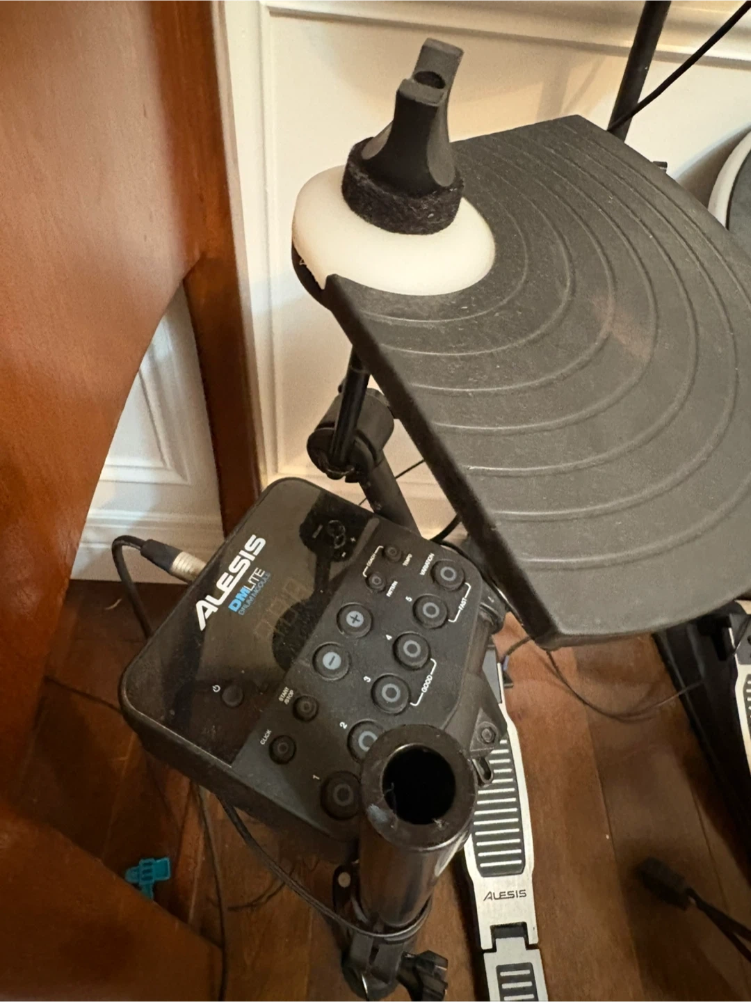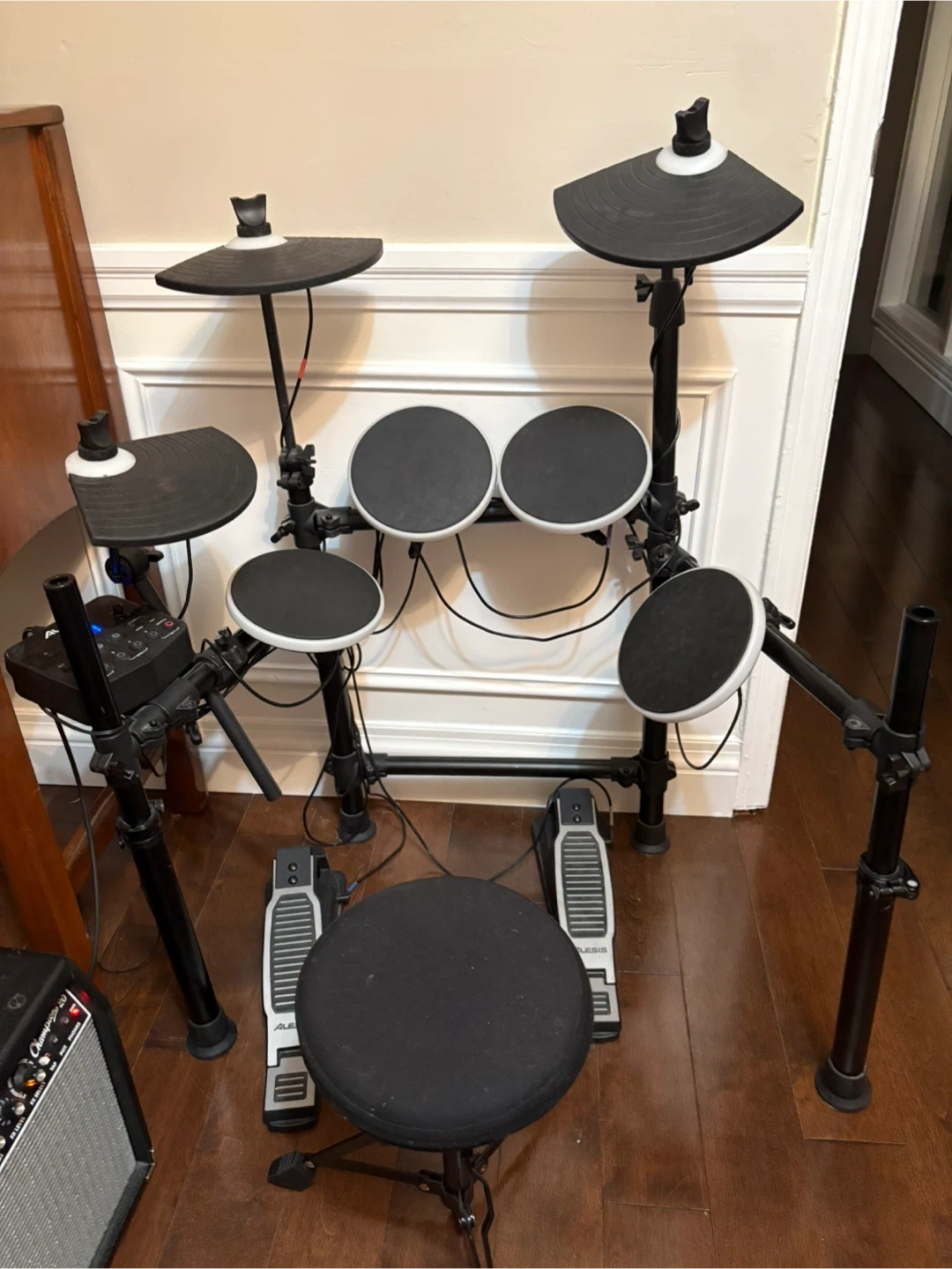 Selling an Alesis DM Lite electronic drum kit with Light-up LED pads and seat. Perfect for kids and small spaces. It's in great shape and ready for a new home. Perfect for beginners or anyone looking for a compact and quiet practice kit. The DM Lite kit is easy to set up and comes with everything you need to start playing right away. More about the drum set: All drum and cymbal pads are mounted to the pre-assembled, height-adjustable, 4-post rack, making set-up a snap. In addition to 200 sounds (fully accessible by external MIDI sources), the DM Lite Module contains a built-in drum coach offering play-along patterns and exercises to improve your skills. Through stereo 1/4" outputs, the DM Lite Kit can be easily connected to an amplifier or sound system to share your performance or an 1/8" headphone output is available for private practice. Plus, there is an 1/8" aux input that allows you to jam out to your favorite tunes from an external audio source. The DM Lite Kit can even connect to your computer via USB for integration with popular software recording programs and virtual instruments. Pick up near Greenwood and Danforth