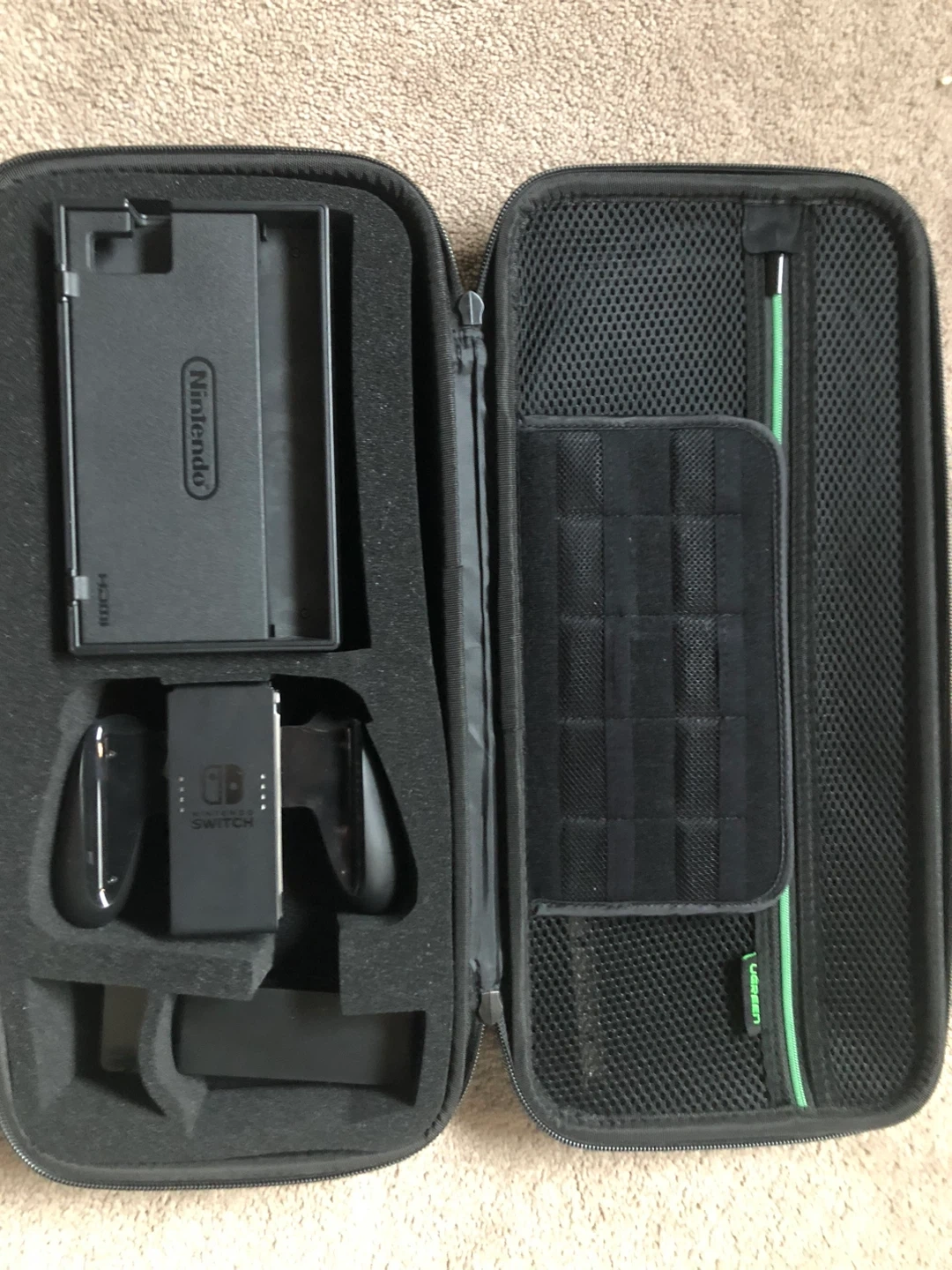 Looking to sell my Ugreen carrying case for the Nintendo Switch. It's in great shape and perfect for keeping your Switch and accessories safe while you're on the go! It has compartments for the dock, joy-cons, and cables