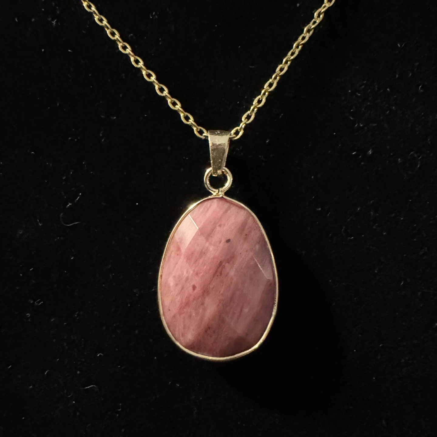 Brand new natural rhodonite stone pendant on gold tone chain necklace. This piece would make a beautiful gift for Christmas or for a loved one’s birthday. Let me know if you require any further information.