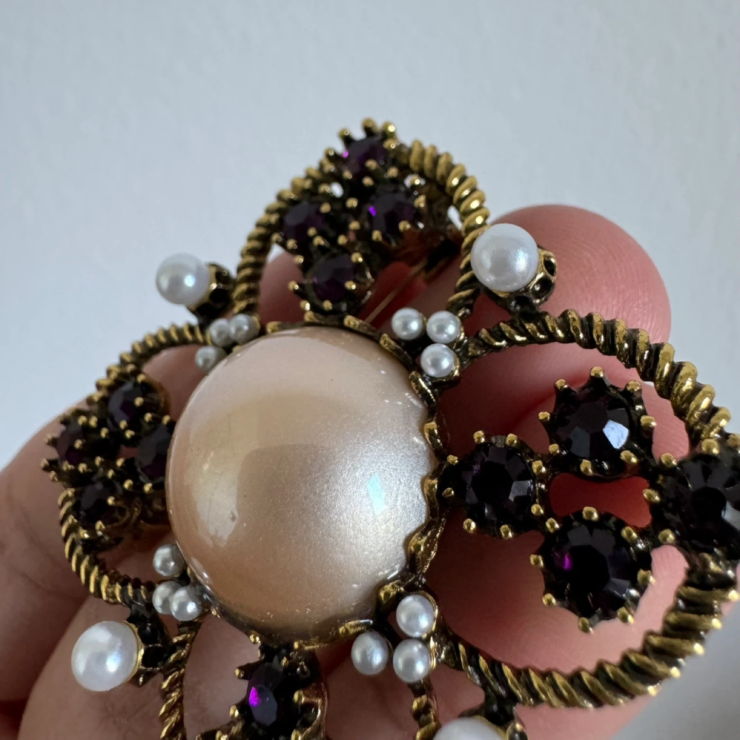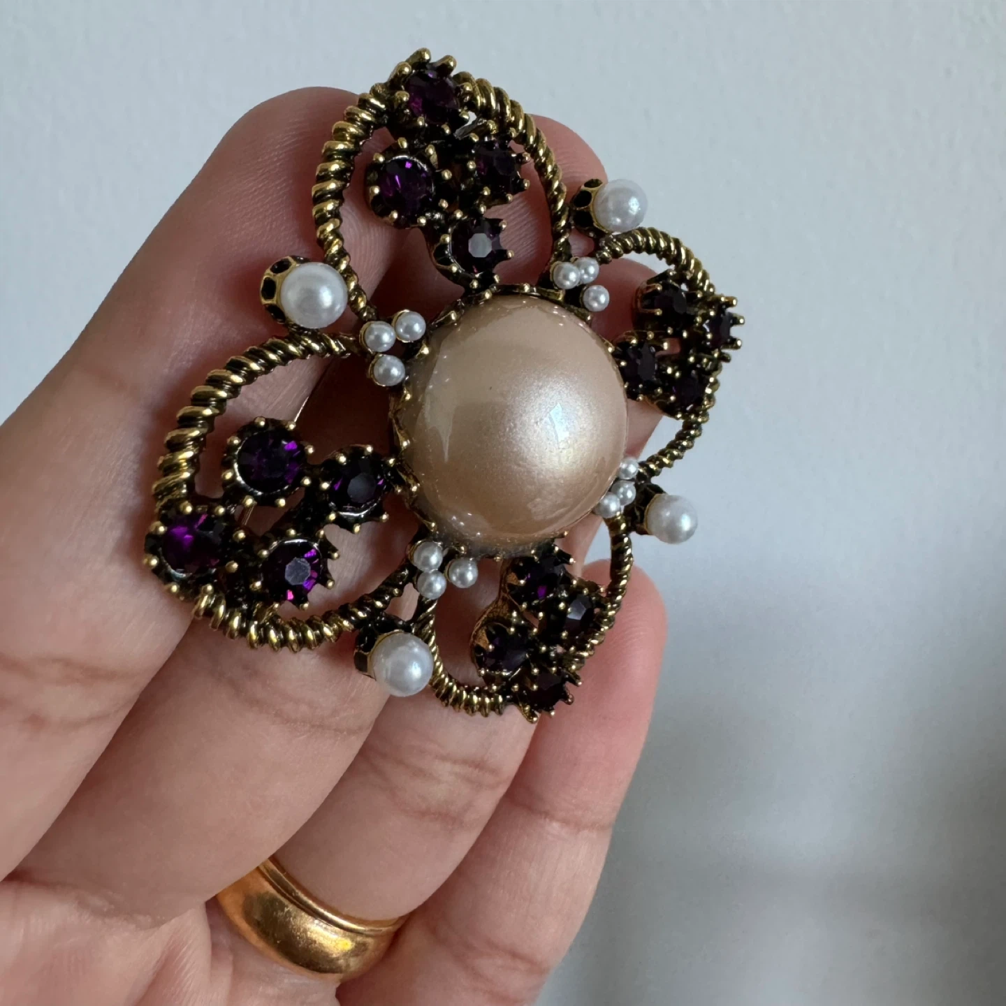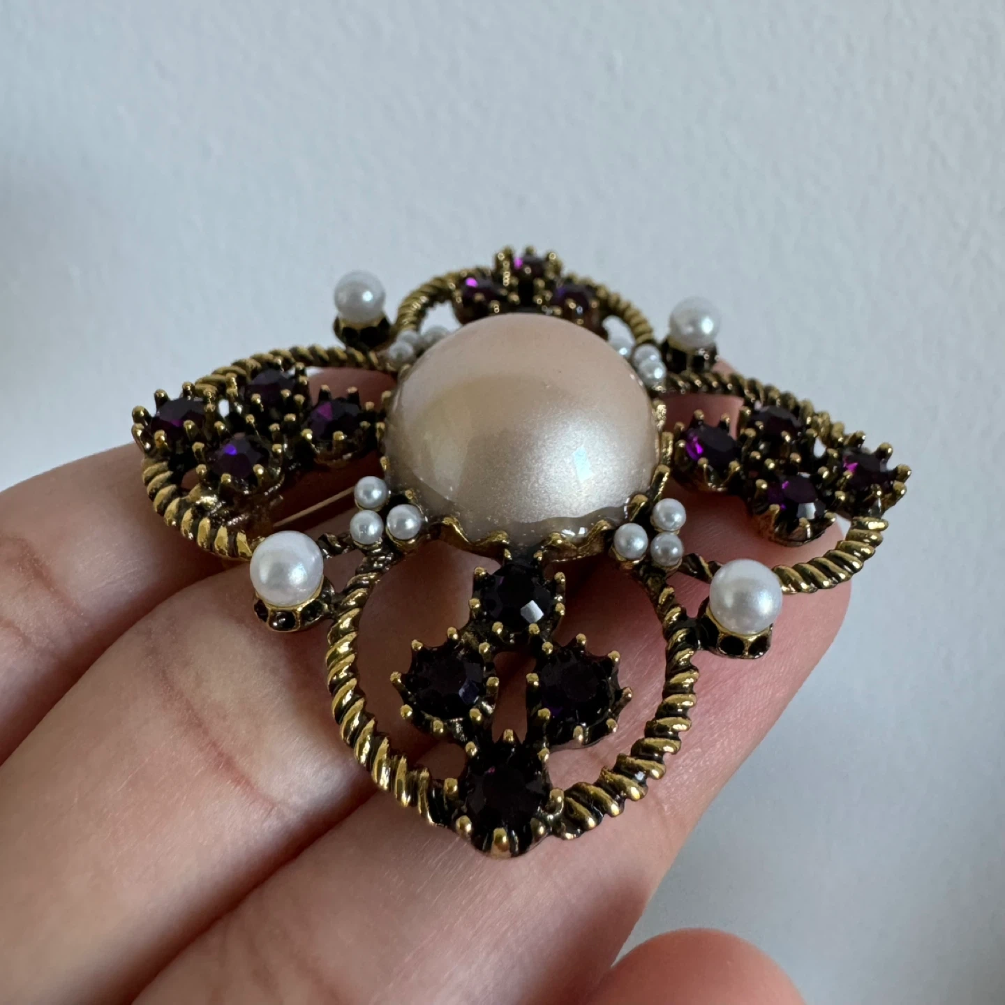 Add this unique retro style brooch to your jewelry collection! Art deco / art nouveau style design that looks like a Maltese cross with a large central pale pink faux pearl. Could also be converted into a pendant—I have a gold tone lariat Y necklace in my closet that can convert any brooch into a pendant (happy to update photos of the brooch on that necklace—just drop me a note!). Let me know if you require further photos/videos of this item.
