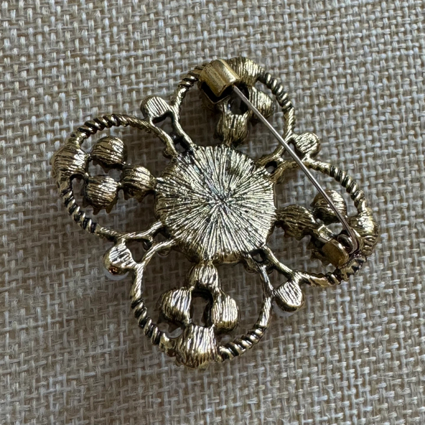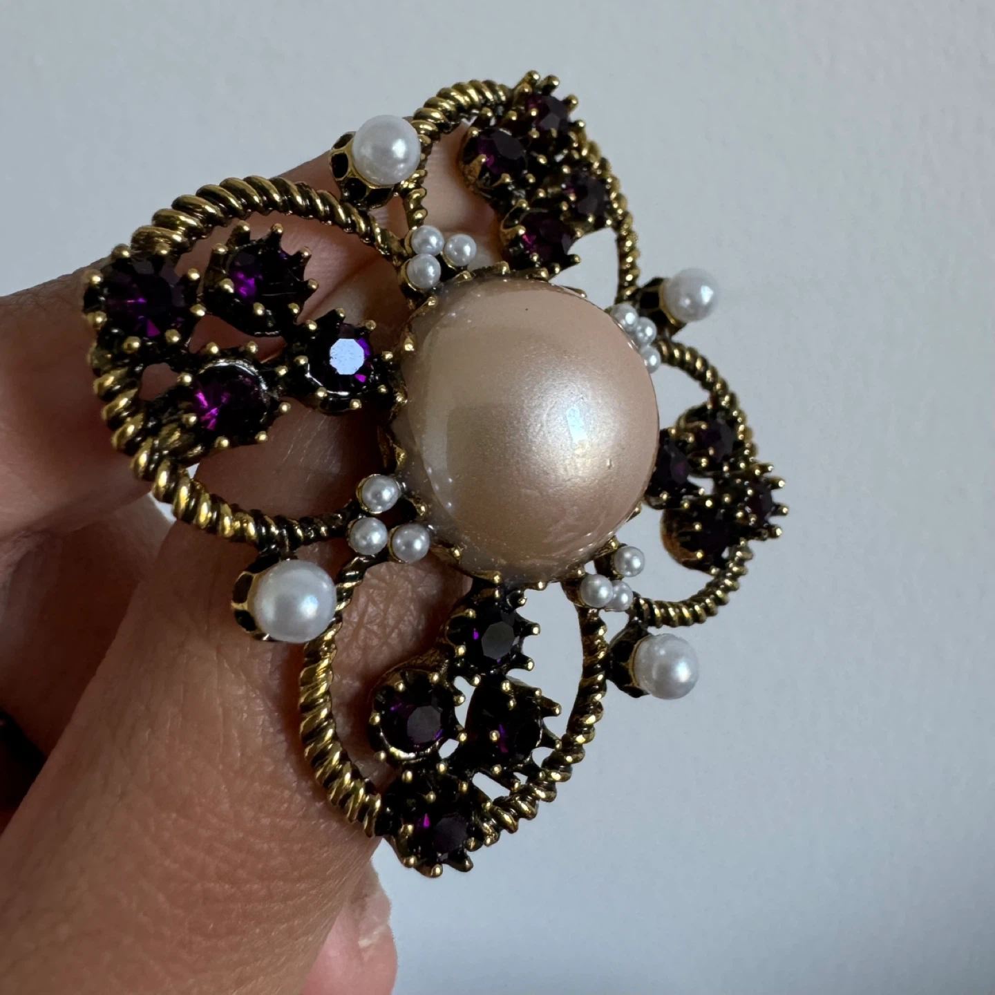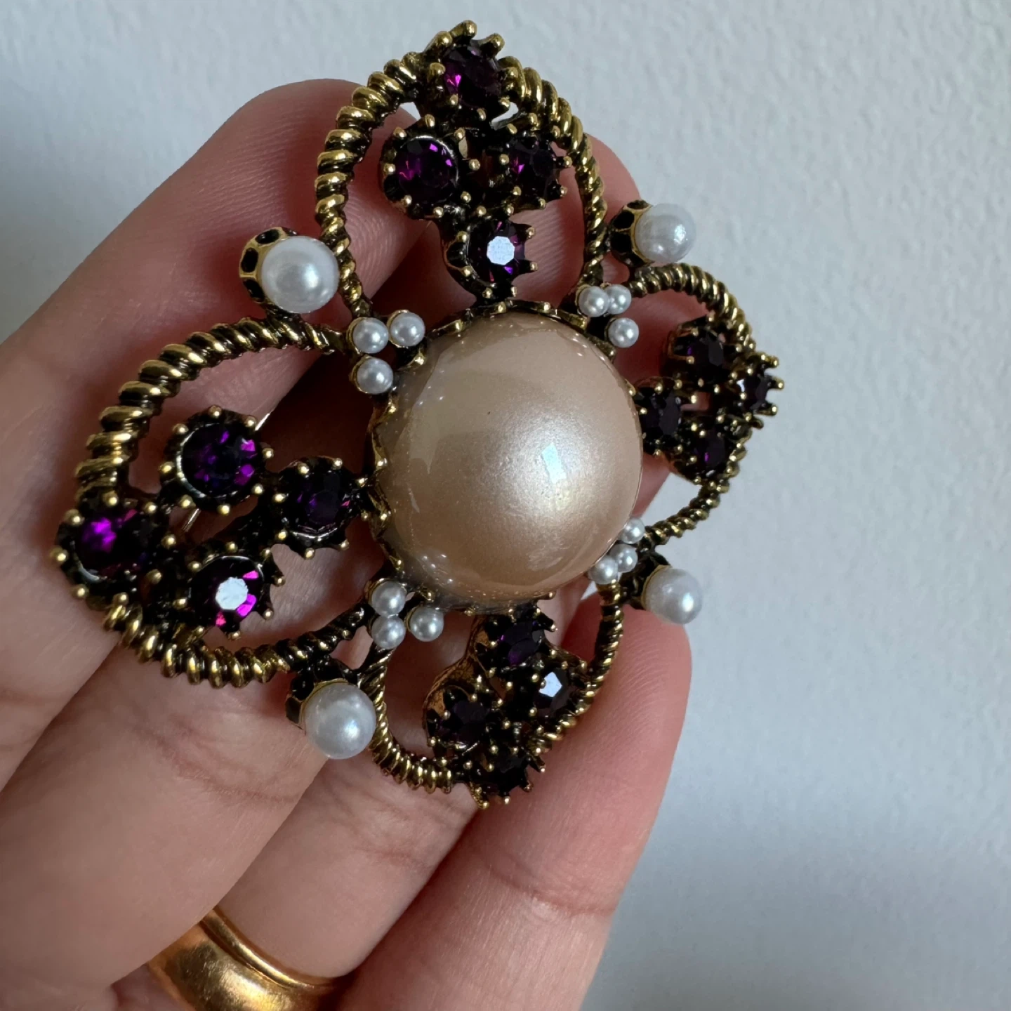 Add this unique retro style brooch to your jewelry collection! Art deco / art nouveau style design that looks like a Maltese cross with a large central pale pink faux pearl. Could also be converted into a pendant—I have a gold tone lariat Y necklace in my closet that can convert any brooch into a pendant (happy to update photos of the brooch on that necklace—just drop me a note!). Let me know if you require further photos/videos of this item.