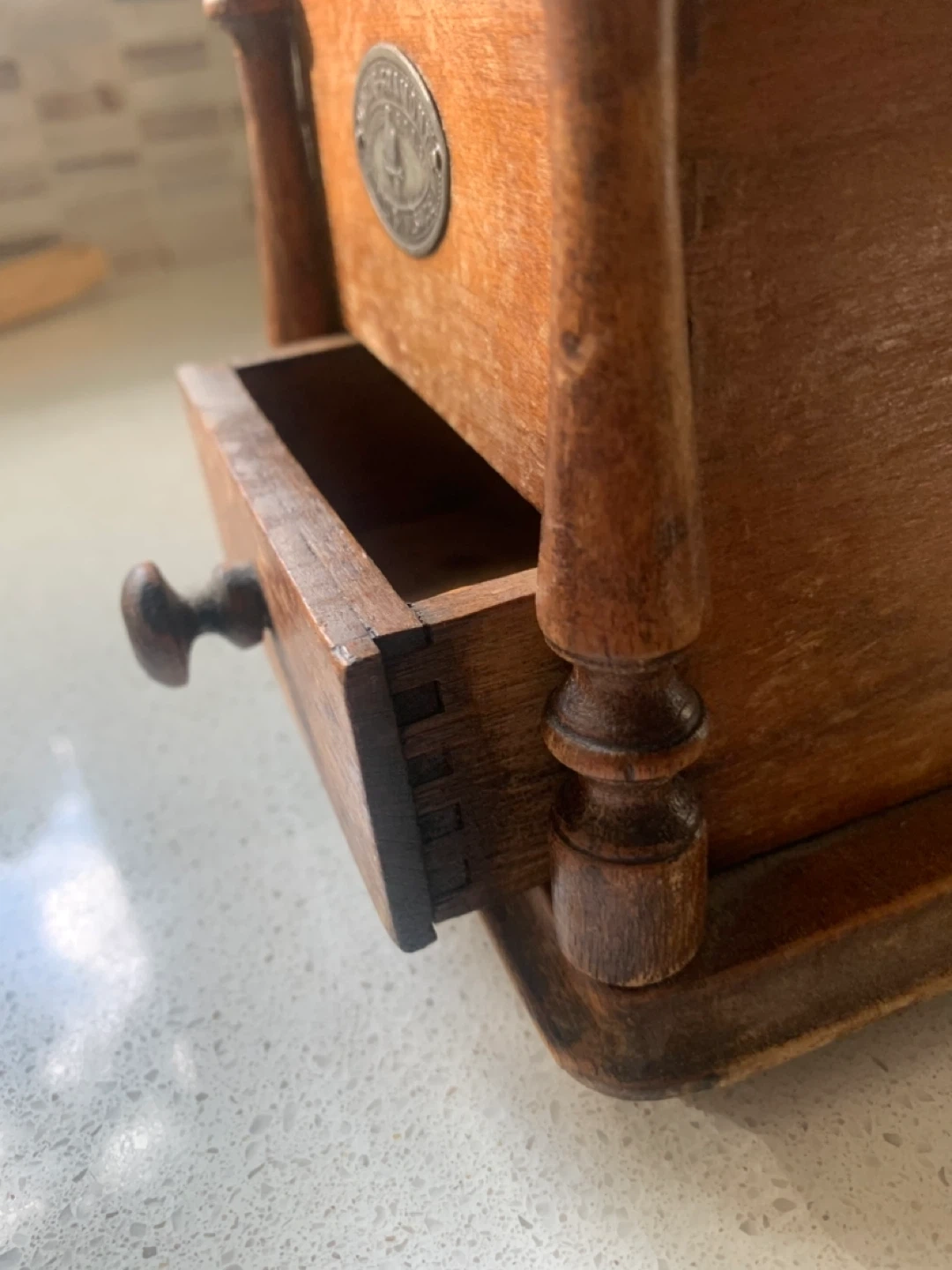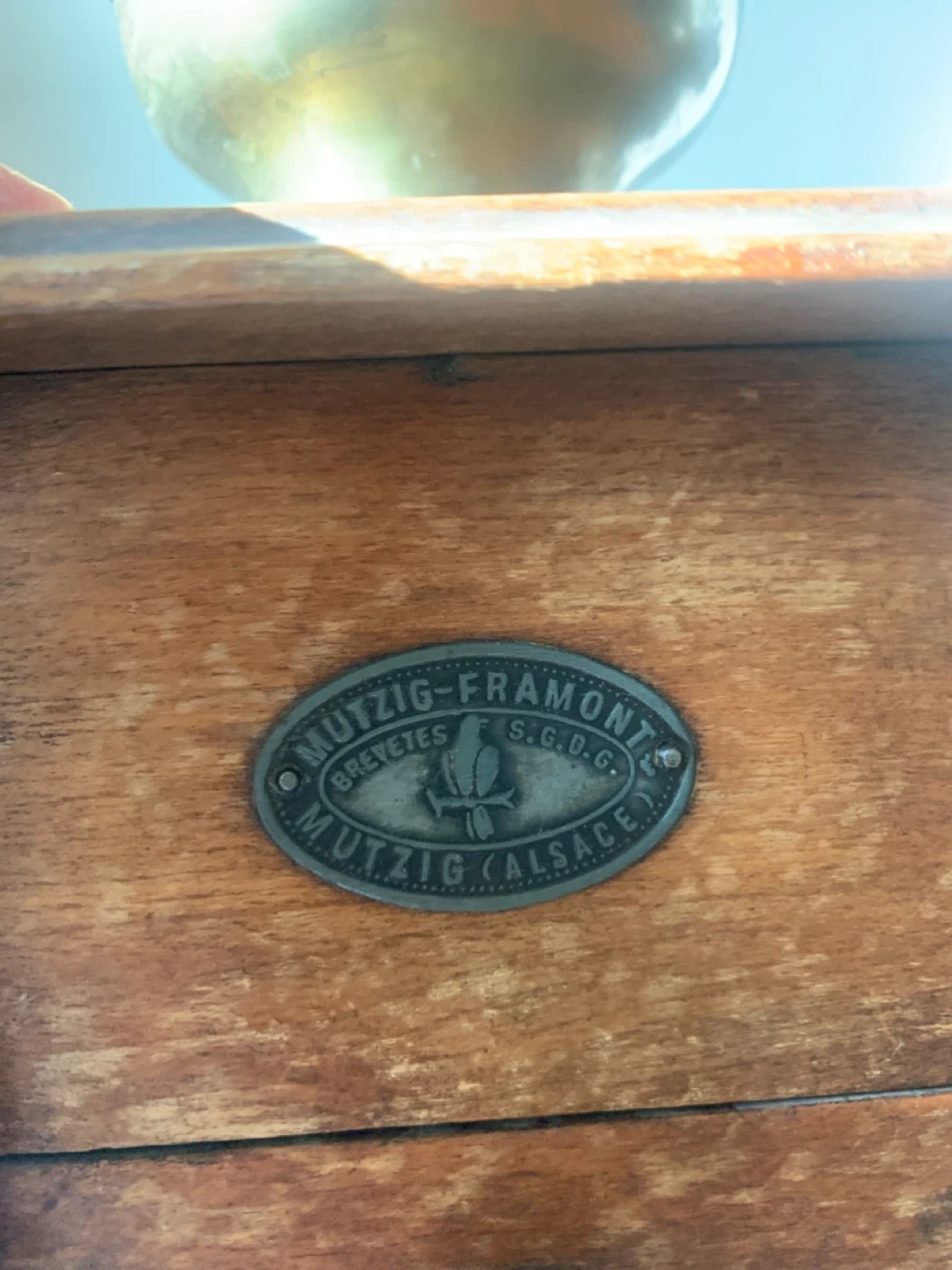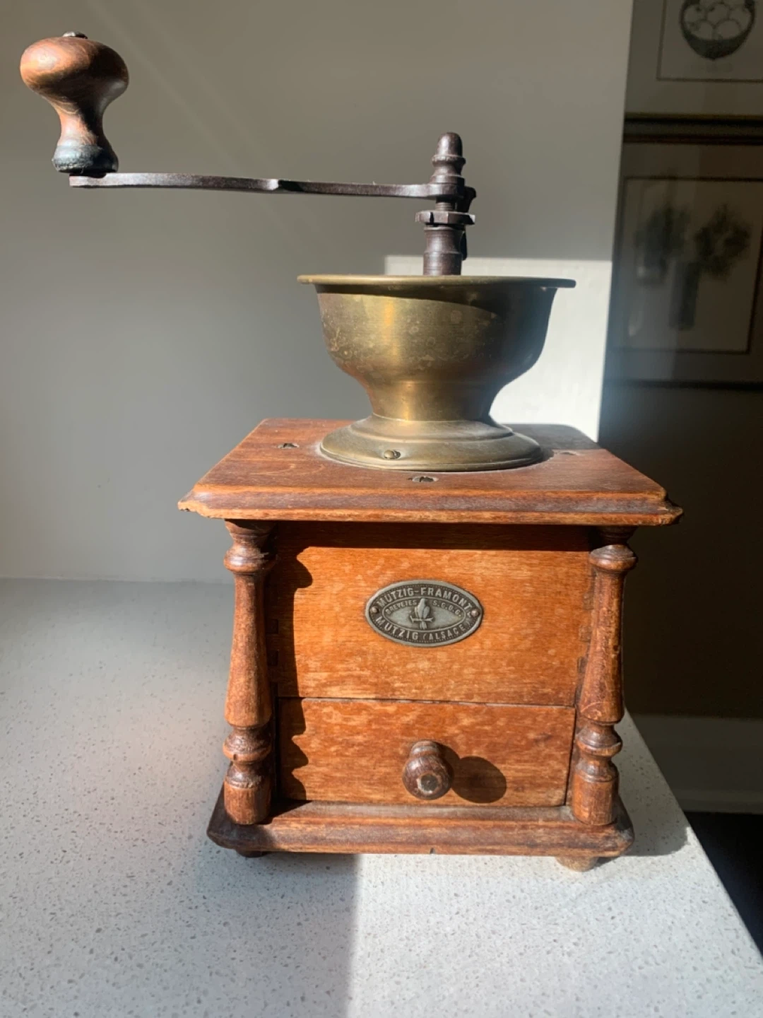 Here's a lovely Mutzig-Framont coffee grinder! It's made of wood and has a metal grinding mechanism. It has a drawer to catch the ground coffee. It would look great in any kitchen!
