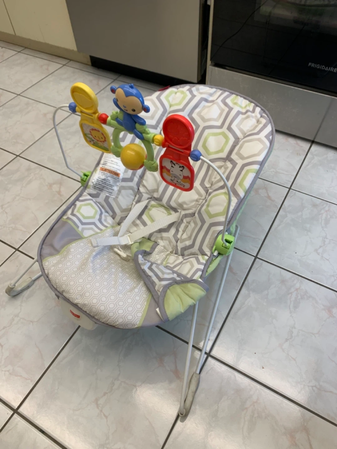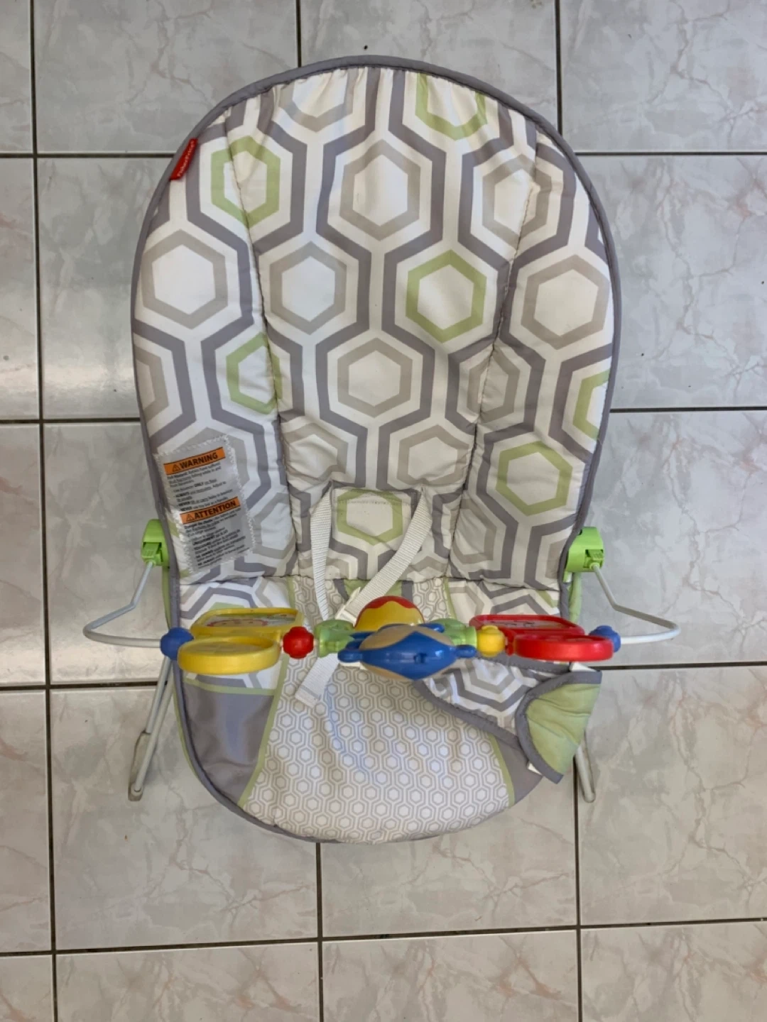 Selling a Fisher-Price baby bouncer in perfect condition! It features a cute geometric pattern and a toy bar with engaging toys to entertain your little one. Perfect for keeping baby happy and safe :) Pick up near Dundas/University