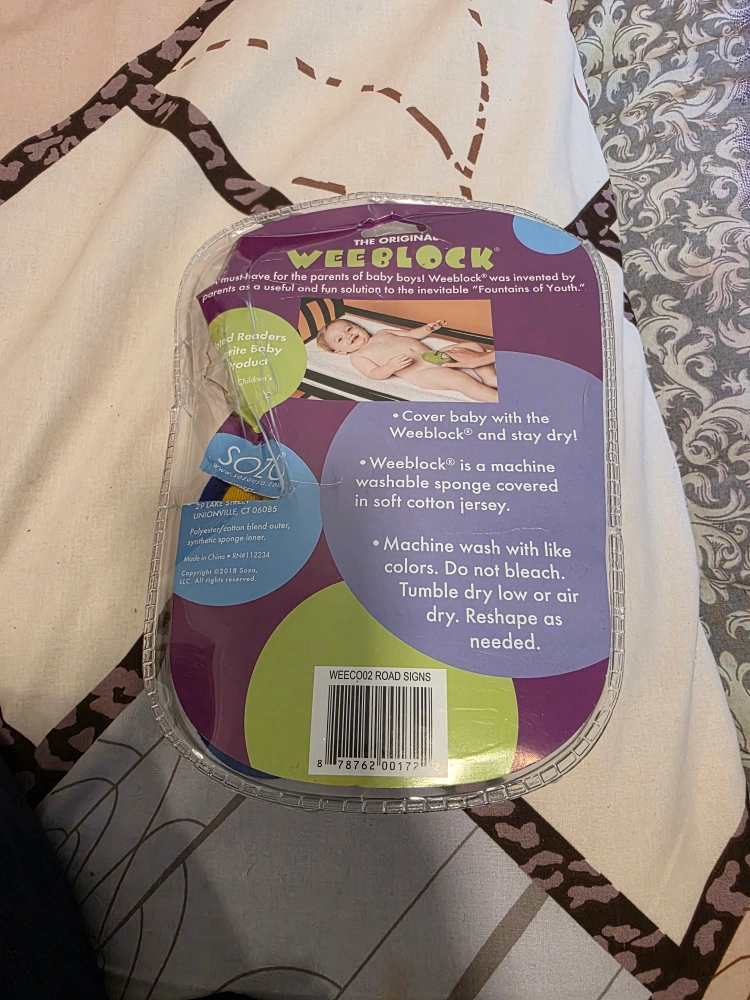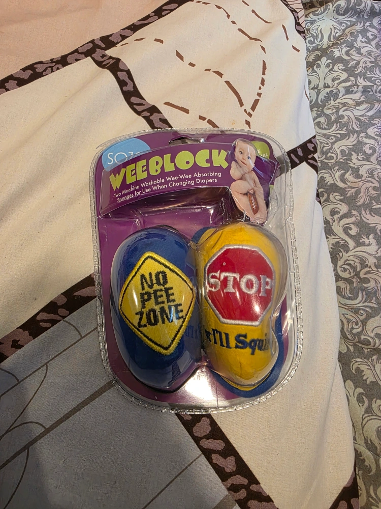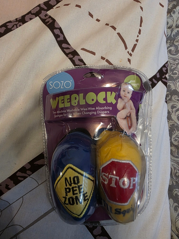 Selling a brand new set of Sozo WeeBlock sponges! These are designed to absorb wee-wee during diaper changes, helping to keep your baby comfortable and dry. They're machine washable and come in a pack of two with different designs, including a "No Pee Zone" and a "Stop" sign. Great for parents of baby boys!