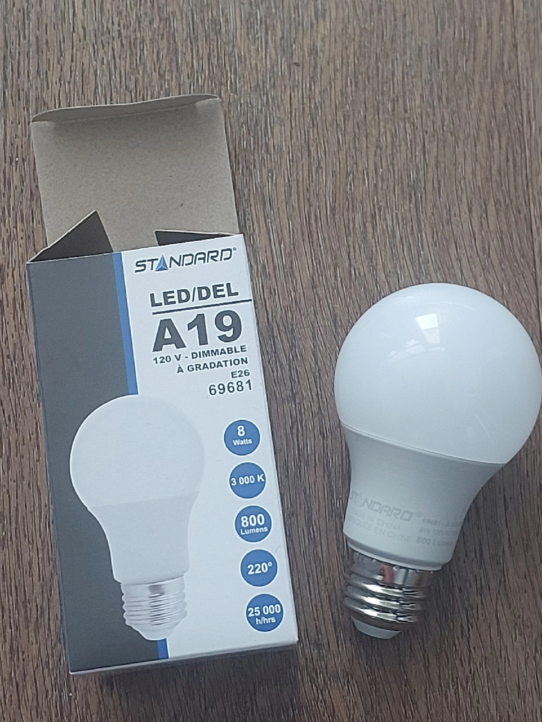 Selling a Standard LED A19 light bulb. It's 8 Watts, 3000K, and provides 800 Lumens. It has a 220° beam angle and a lifespan of 25,000 hours. The bulb is dimmable and works with 120V. It comes in its original box