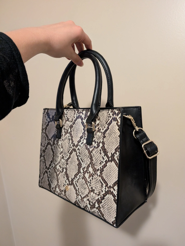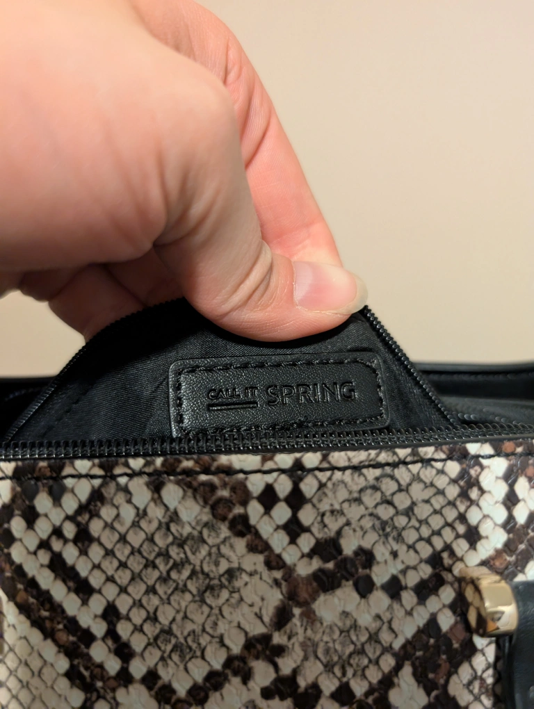 Call It Spring purse with a snakeskin print. It has black handles and trim. It's in great condition!