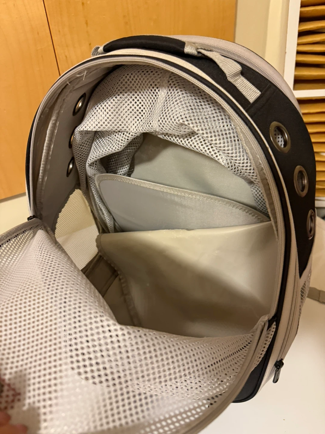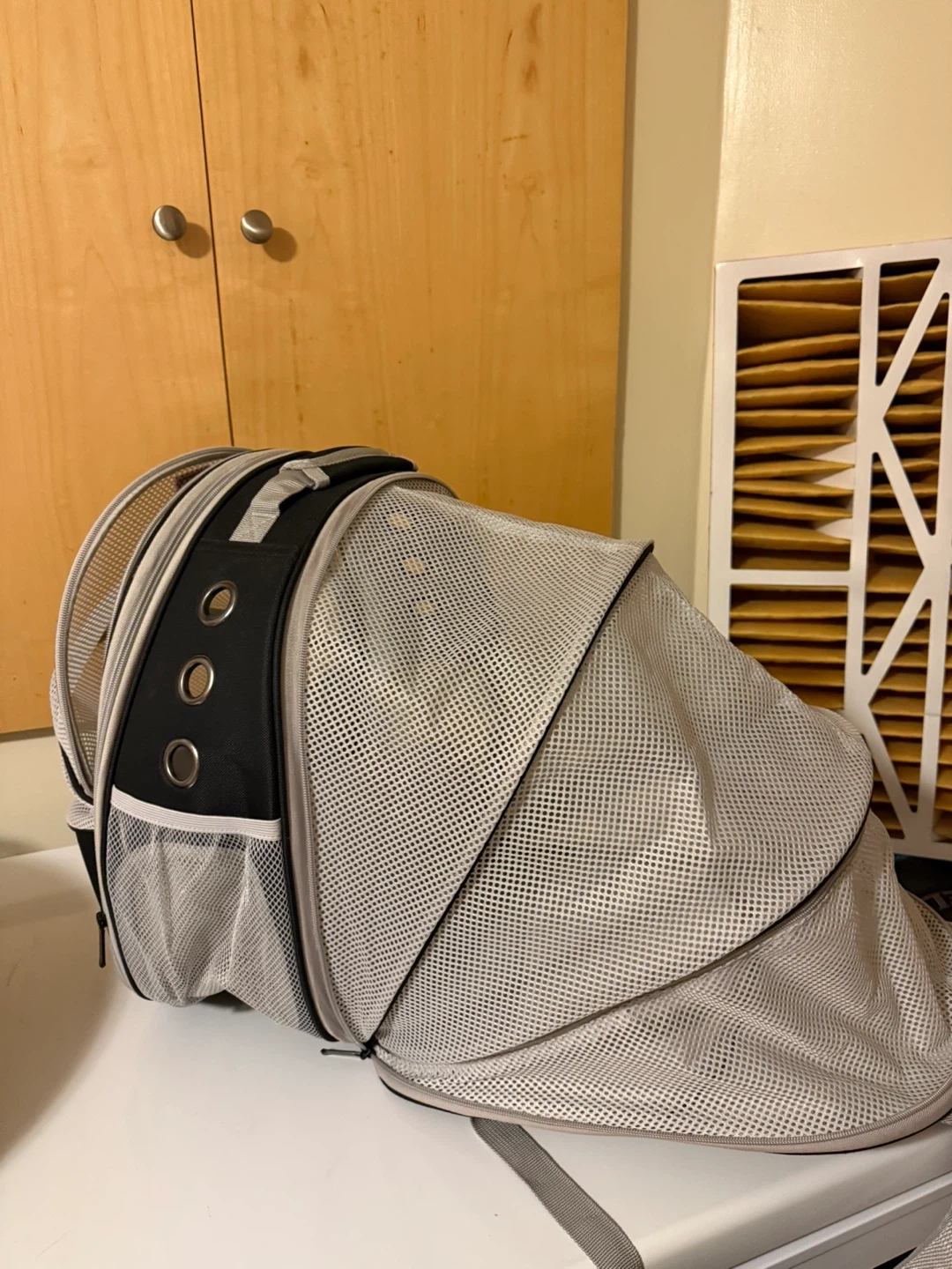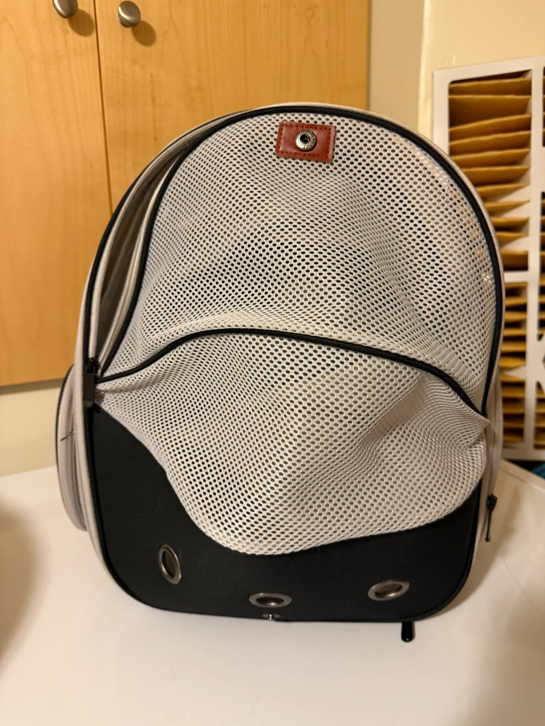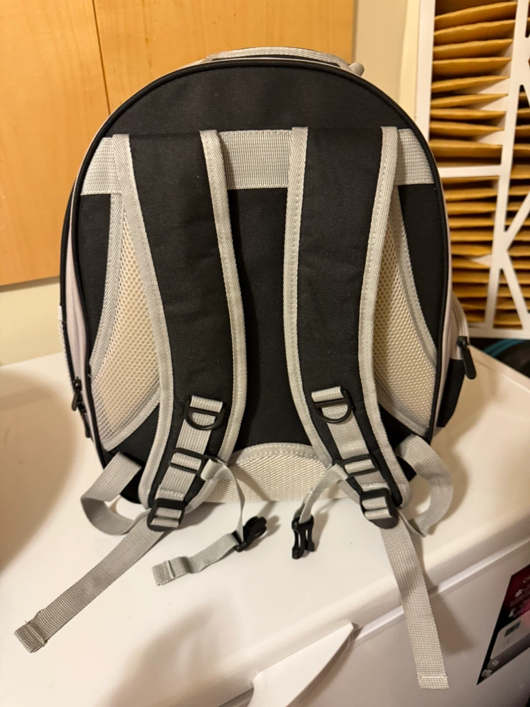 Selling a pet carrier backpack in black and grey! It looks to be in great condition and ready for your furry friend's next adventure. Perfect for small dogs or cats, this backpack is designed for comfort and convenience. It features mesh windows for ventilation and visibility, and padded straps for comfortable carrying. It's a great way to take your pet with you on walks, hikes, or trips to the vet