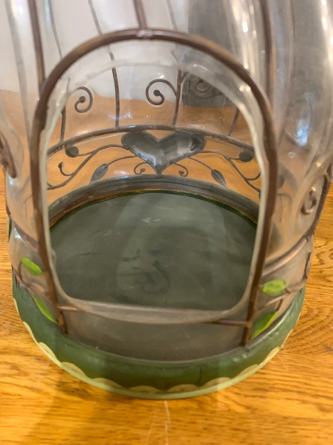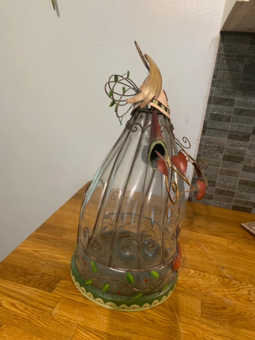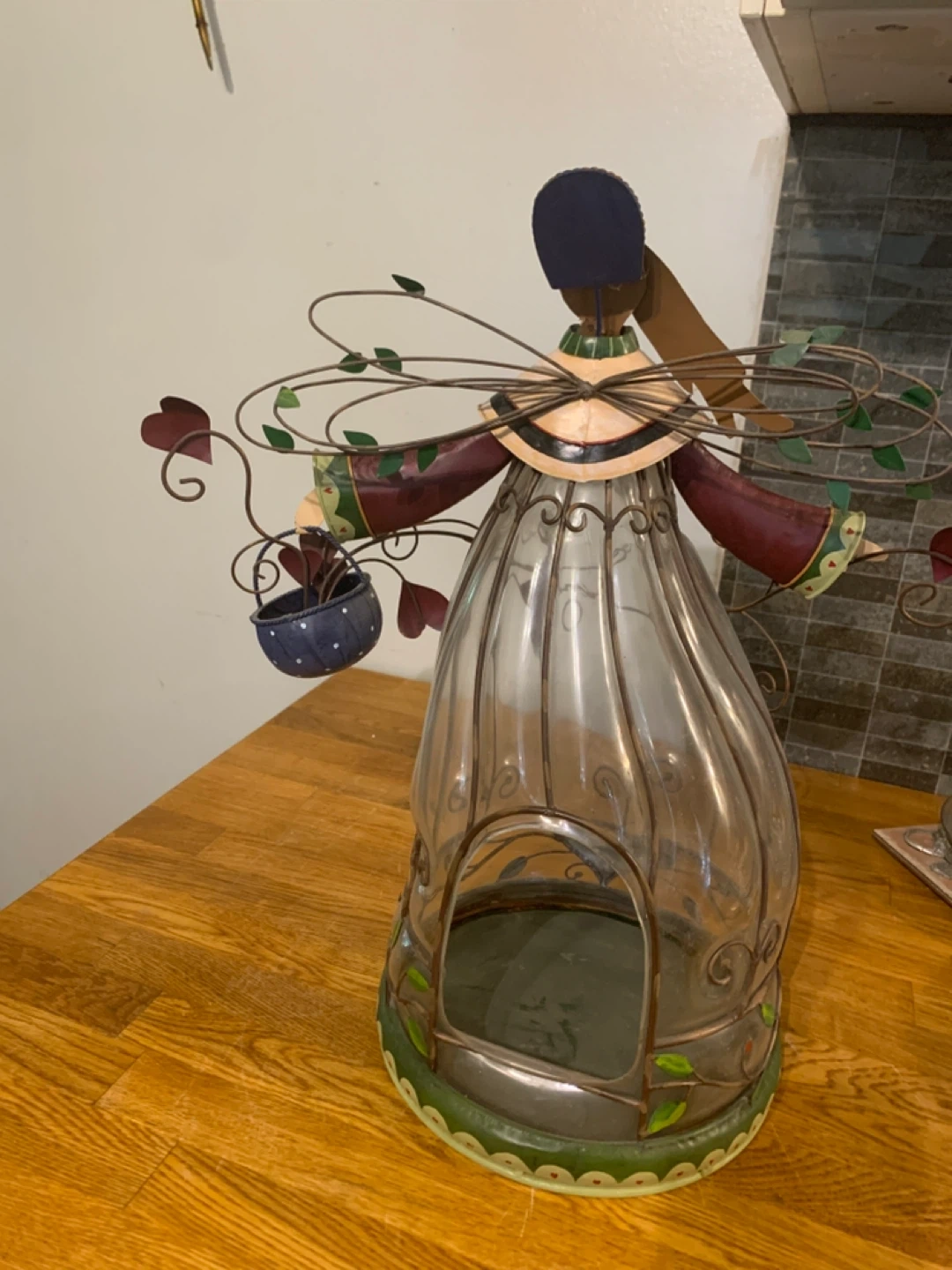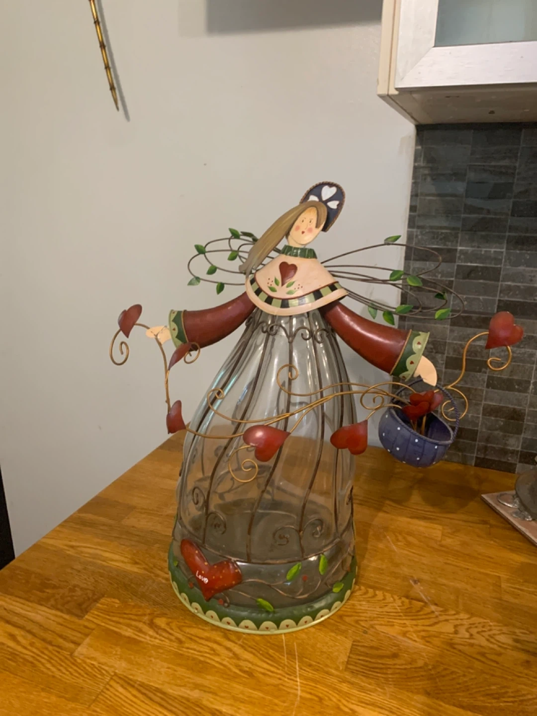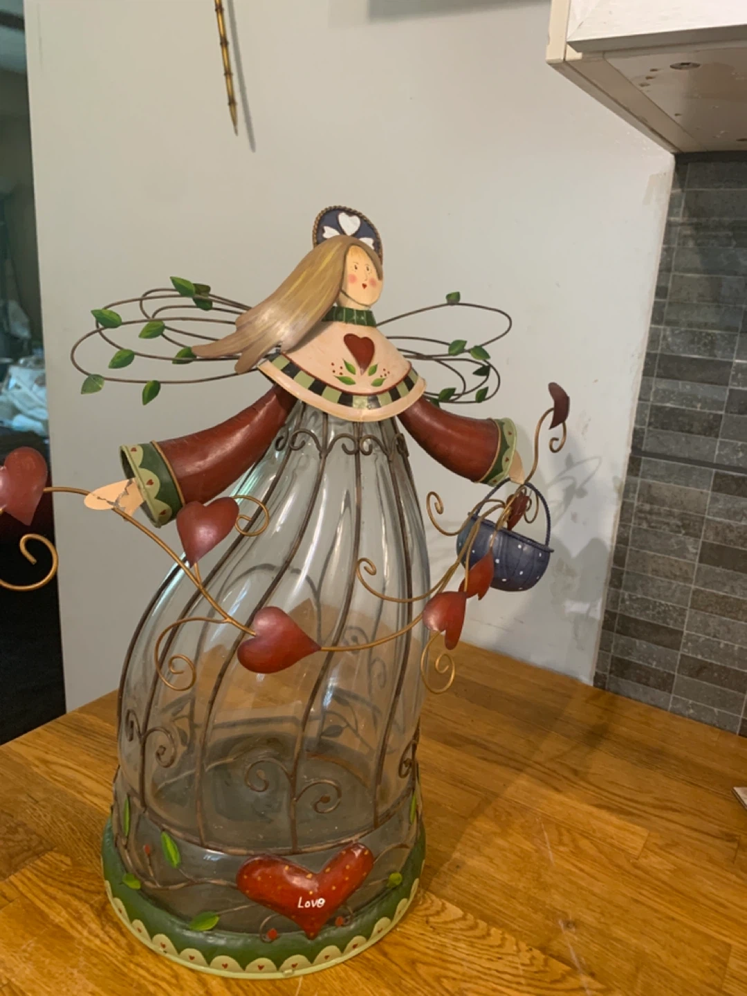 This unique angel figurine also functions as a glass vase! The metal detailing and heart accents add a charming touch to any room. Perfect for displaying flowers or as a decorative piece on its own