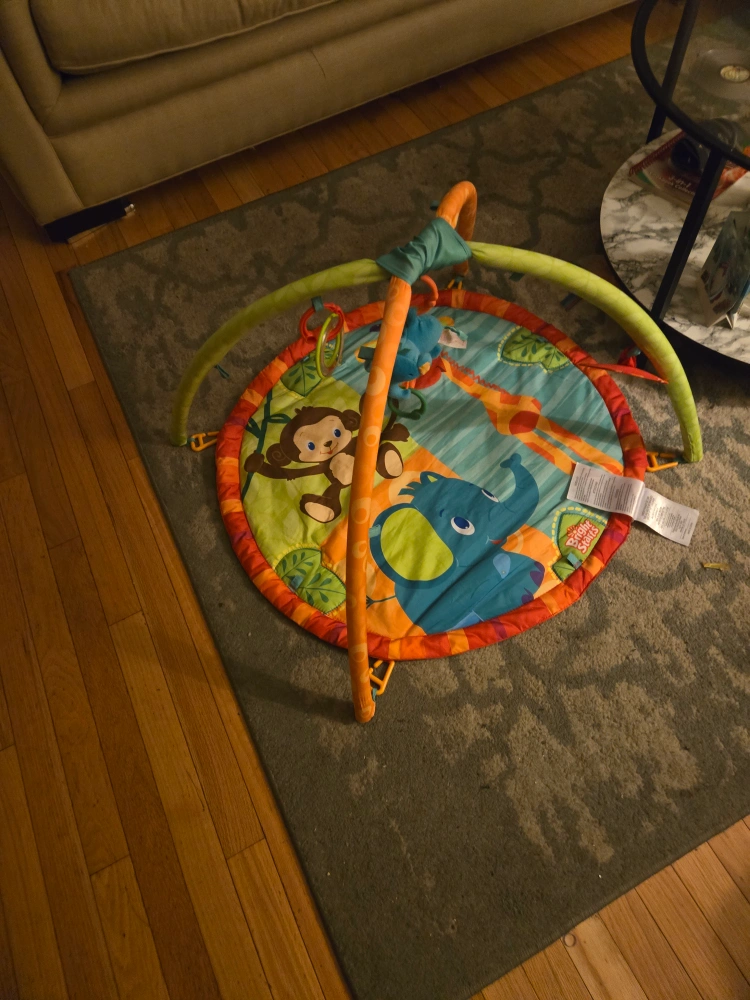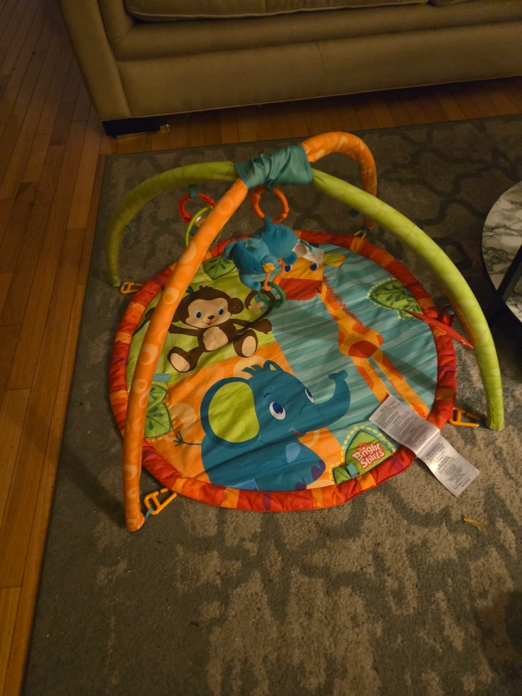 Selling a Bright Starts activity gym play mat. It's in great condition and ready for a new little one! Features a colourful design with a monkey and elephant, perfect for tummy time and early development