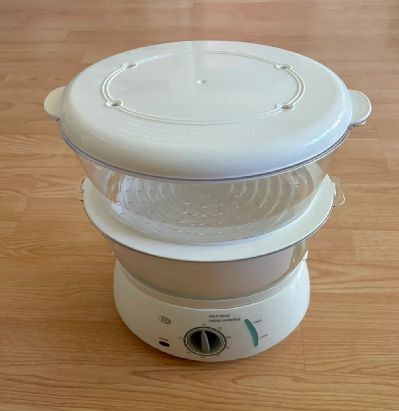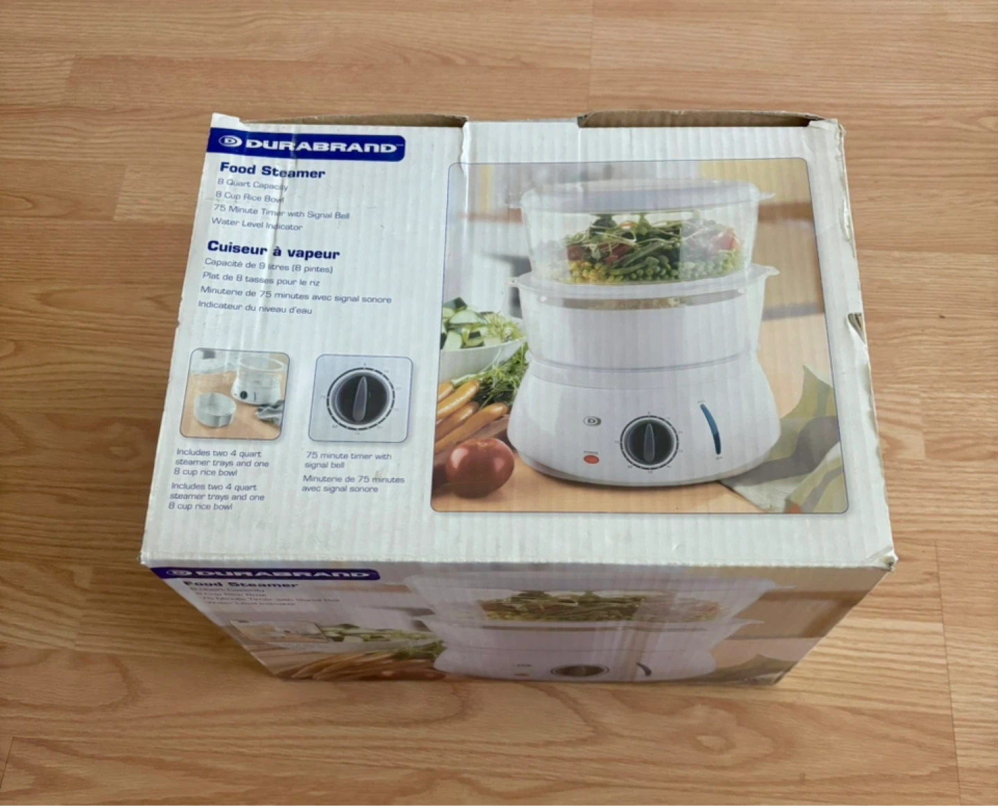 Selling a new DuraBrand food steamer! It's an 8-quart capacity steamer with an 8-cup rice bowl. It also features a 75-minute timer with a signal bell and a water level indicator. Includes two 4-quart steamer trays and one 8-cup rice bowl. Opened but never used. Pickup and cash only.