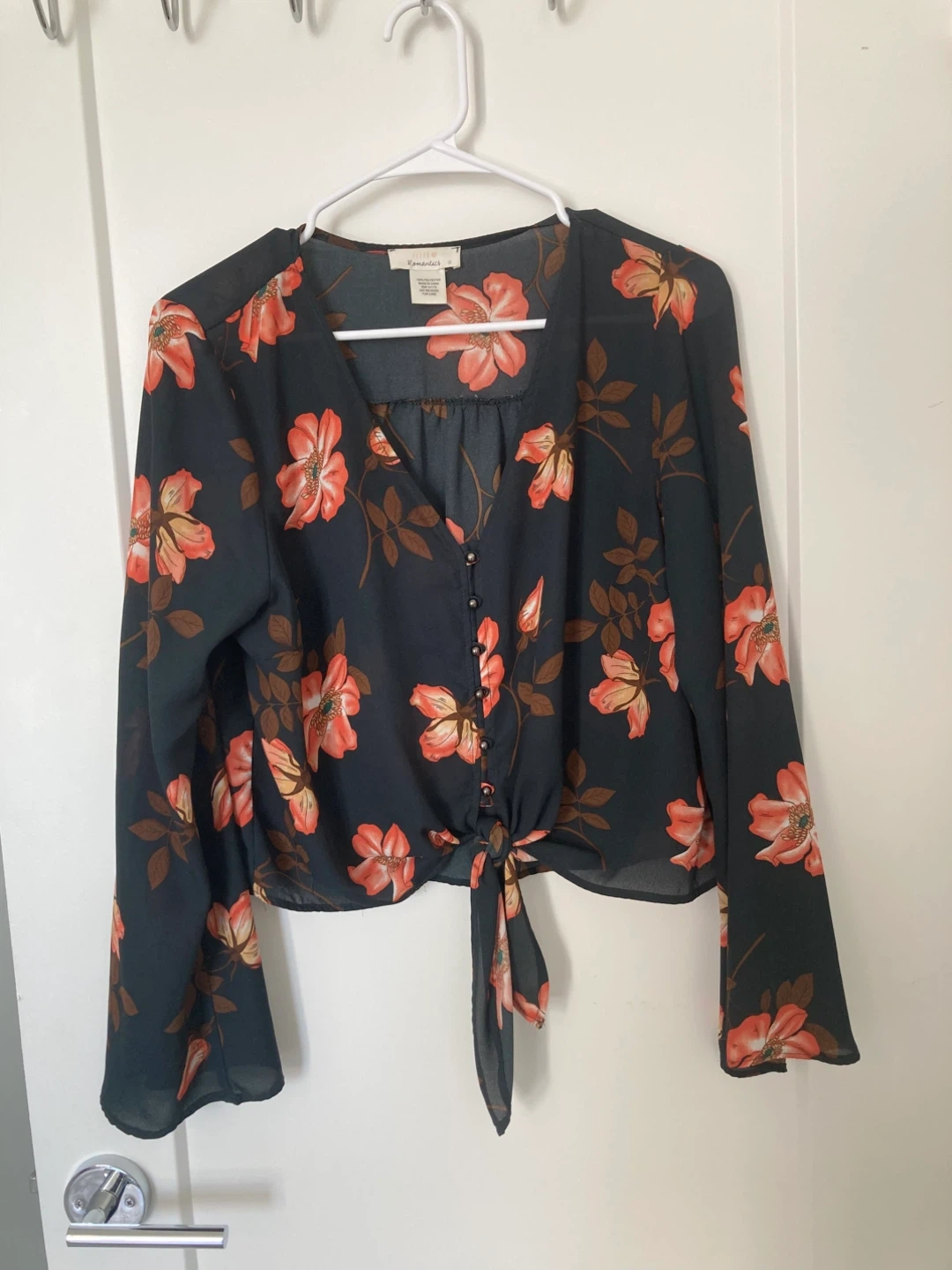 This is a cute Urban Romantics blouse with a floral pattern. It's a size small and features a tie-front detail. The material is 100% polyester, making it lightweight and easy to care for. Perfect for adding a touch of spring to your wardrobe!