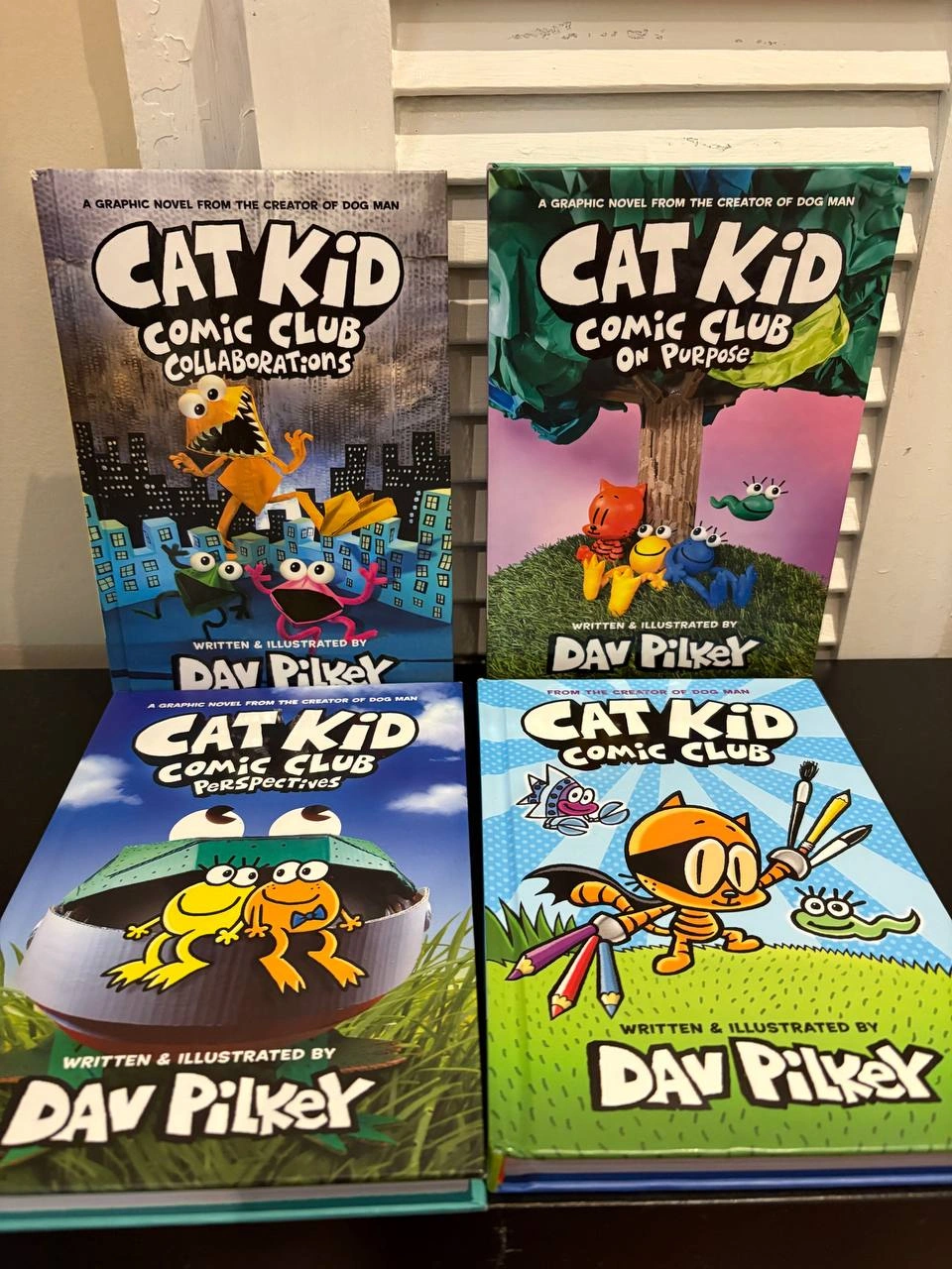 Selling a set of Cat Kid Comic Club books by Dav Pilkey! Includes Collaborations, On Purpose, Perspectives, and another one from the series. Perfect for young readers who enjoy graphic novels and humour! THE ORIGINAL PRICE IS 65$