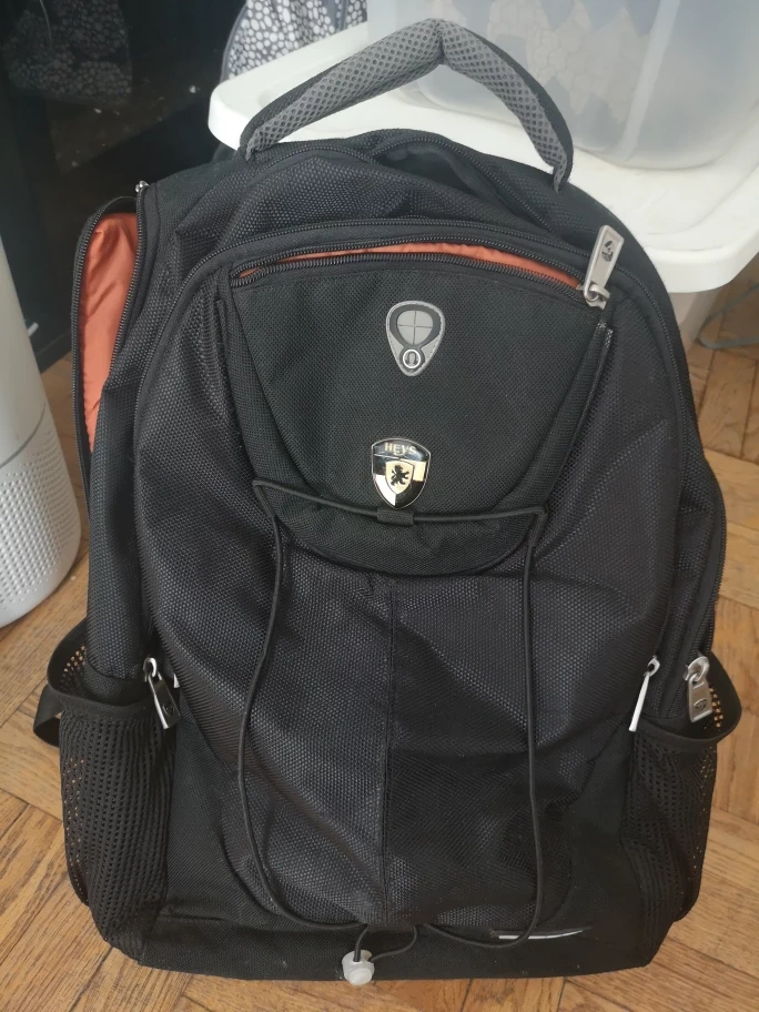 Looking to pass along this handy Heys backpack! It's black with grey accents and some orange lining inside. Lots of pockets and compartments to keep everything organized