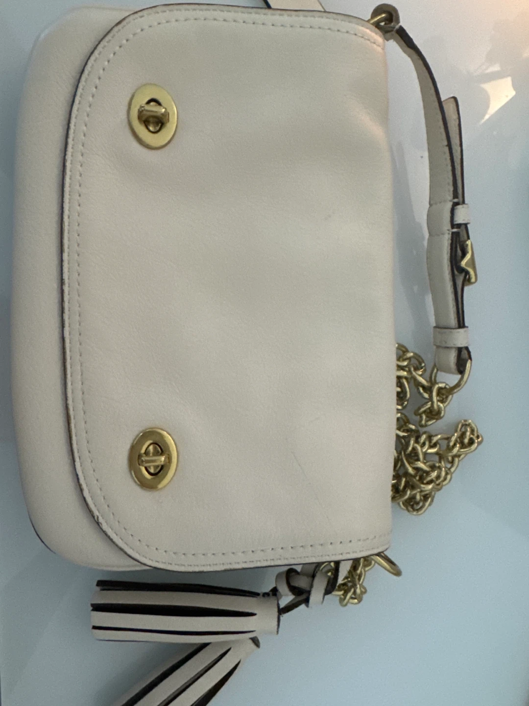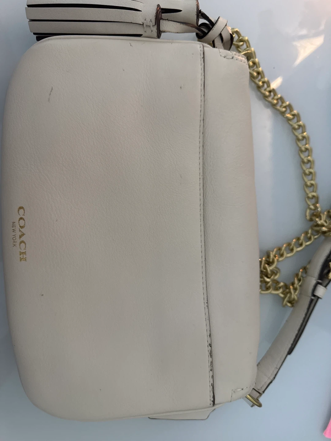 Selling a Coach crossbody bag in ivory leather. It features a gold chain strap and a tassel detail. It's in good condition and perfect for everyday use!