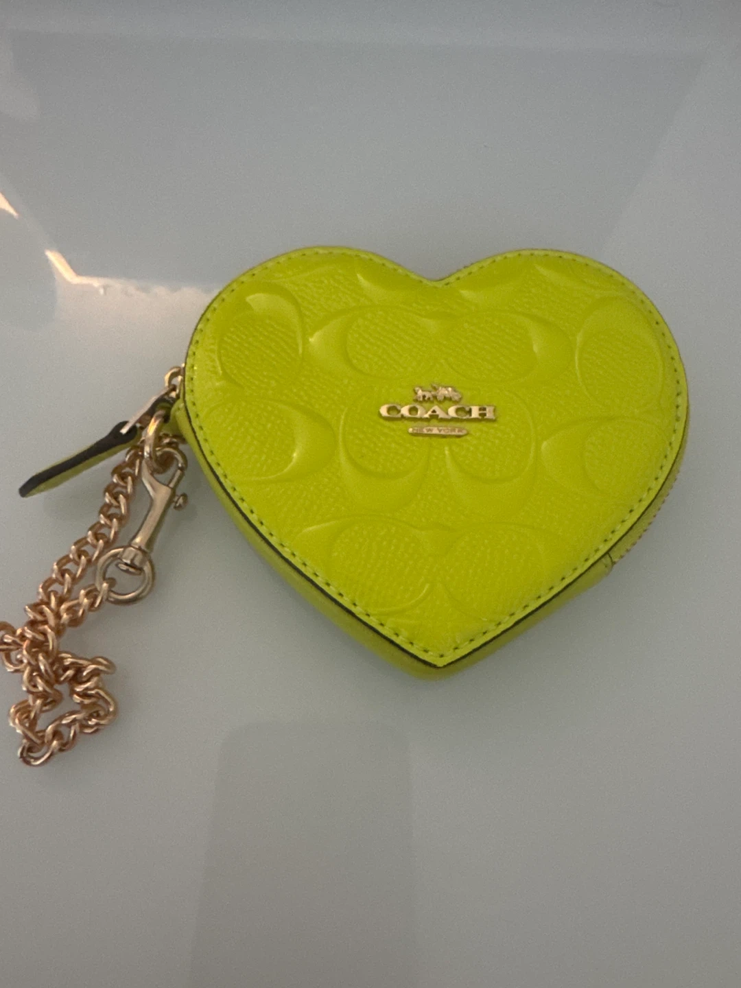 Super cute Coach heart-shaped coin purse in a vibrant neon yellow! It features the Coach logo pattern and a gold chain detail. Perfect for adding a pop of colour to your accessories!