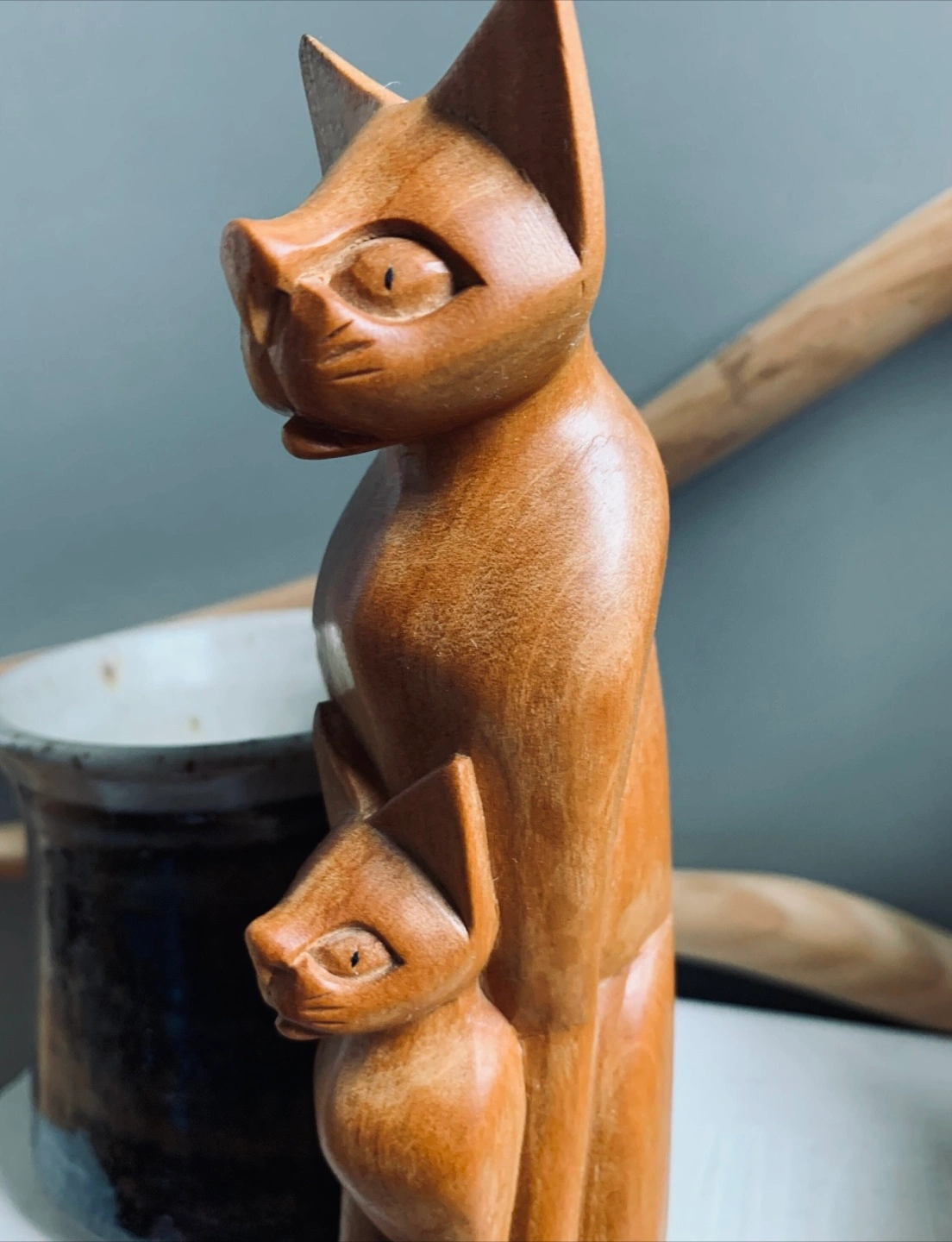 ➡️Cash & Pickup ONLY First come first serve A graceful hand-carved Vintage cat family statue made from striped lightweight wood. Softly polished with a natural finish, perfect for minimalist, boho, or modern spaces. A thoughtful gift for any cat lover, lovely as decor, a housewarming present, cake topper or stocking stuffer. In good vintage condition. MEASUREMENTS: Height: 6 Inch Width: 1.5 Inch Depth: 2.25Inch