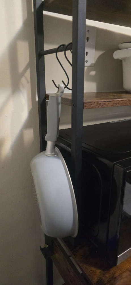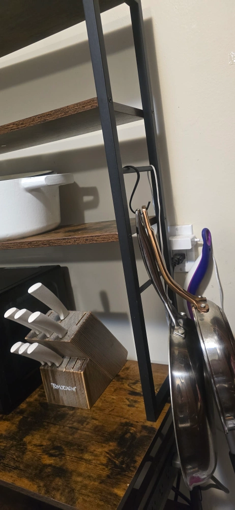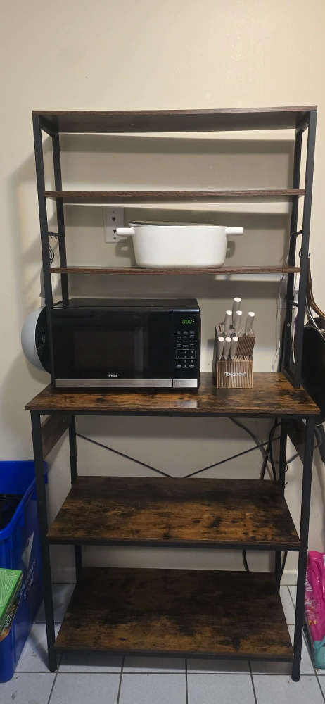 Selling a kitchen baker's rack with multiple shelves. It's perfect for organizing your kitchen essentials and adding some extra storage space. Great for small kitchens or apartments! It can hold your microwave, pots, pans, and even has hooks for hanging utensils Standing at 15.7"D x 31.5"W x 65.7"H, this 6-tier kitchen shelf with 4 AC outlets for multiple appliances, is a perfect fit for compact kitchens or works great as a mini coffee bar, letting you make full use of your space
