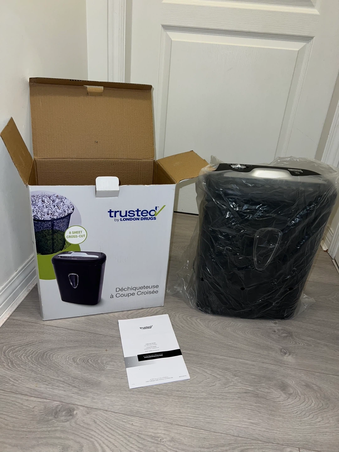 Selling a Trusted by London Drugs cross-cut paper shredder. It can shred up to 8 sheets at a time. Comes with the original box and manual! Like new