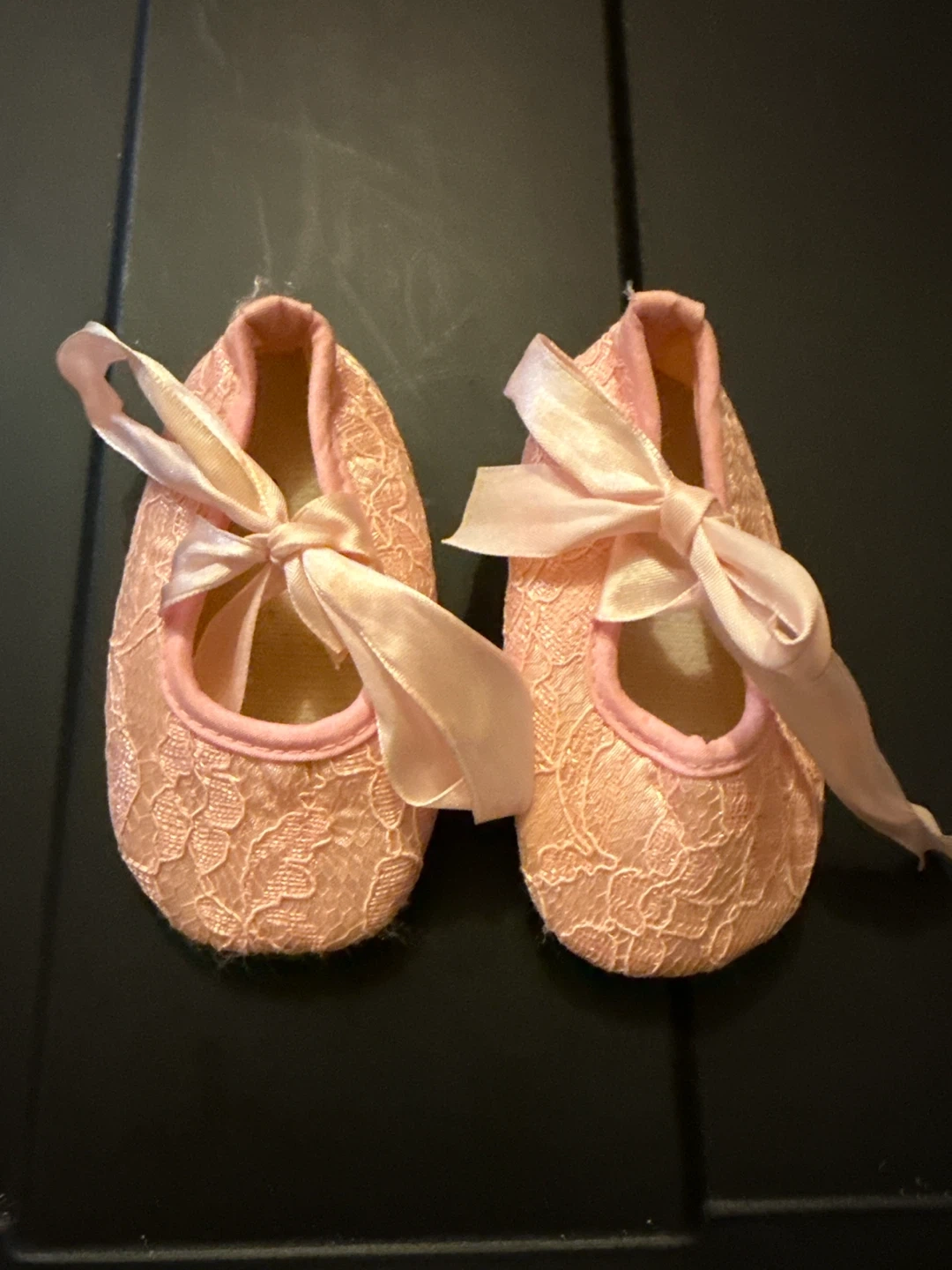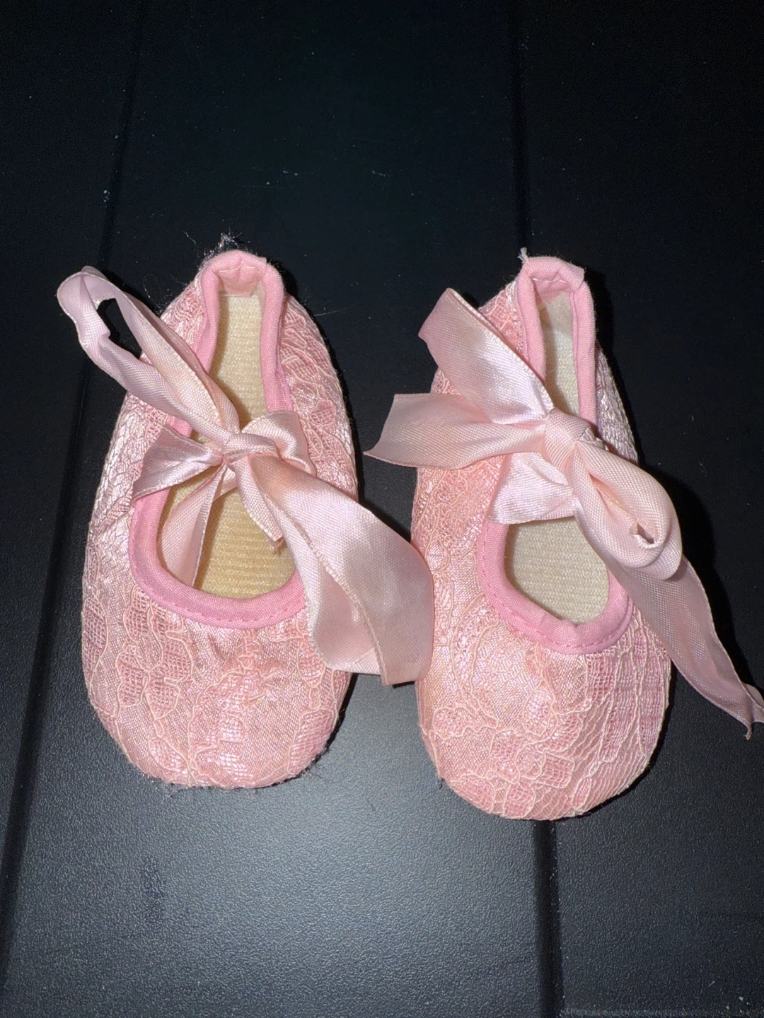 These adorable pink baby ballet shoes are perfect for your little one! They feature a delicate lace pattern and a sweet satin ribbon tie. They appear to be in great condition and ready for a new home