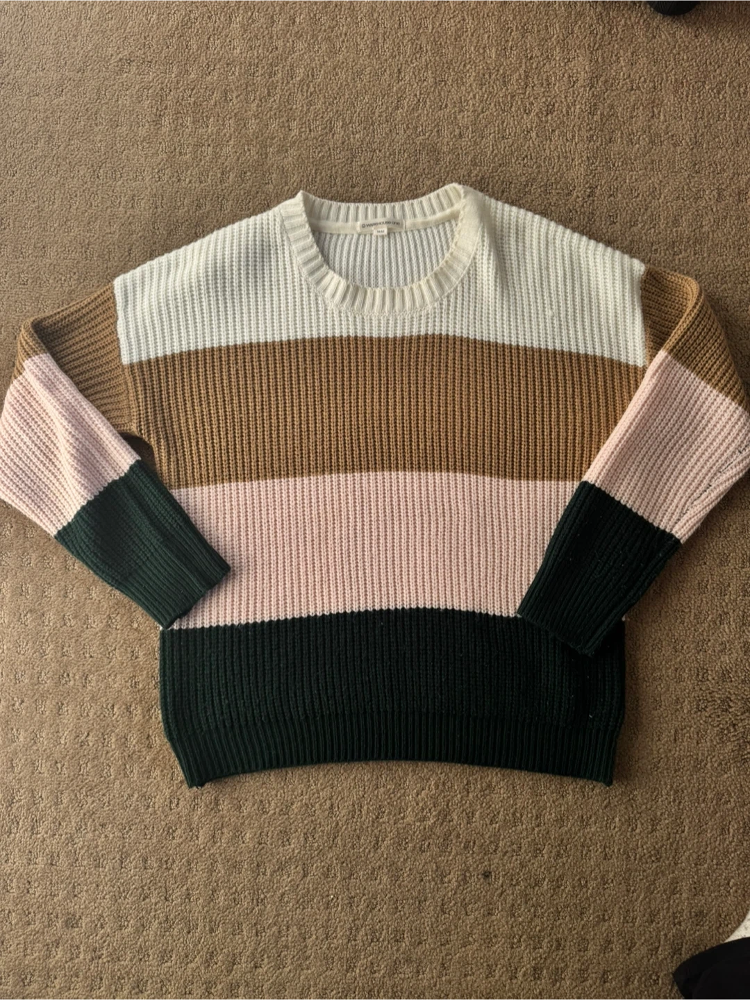 Cozy Wonderly sweater in size medium! Features a crew neck and a stylish striped pattern with colours including white, brown, pink, and green. Perfect for adding a pop of colour to your wardrobe and staying warm on chilly days