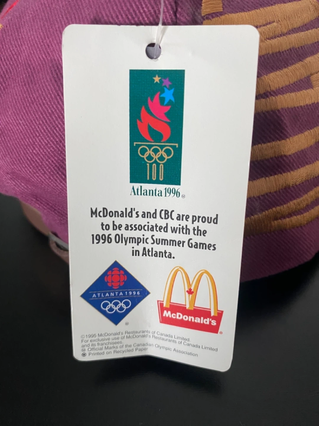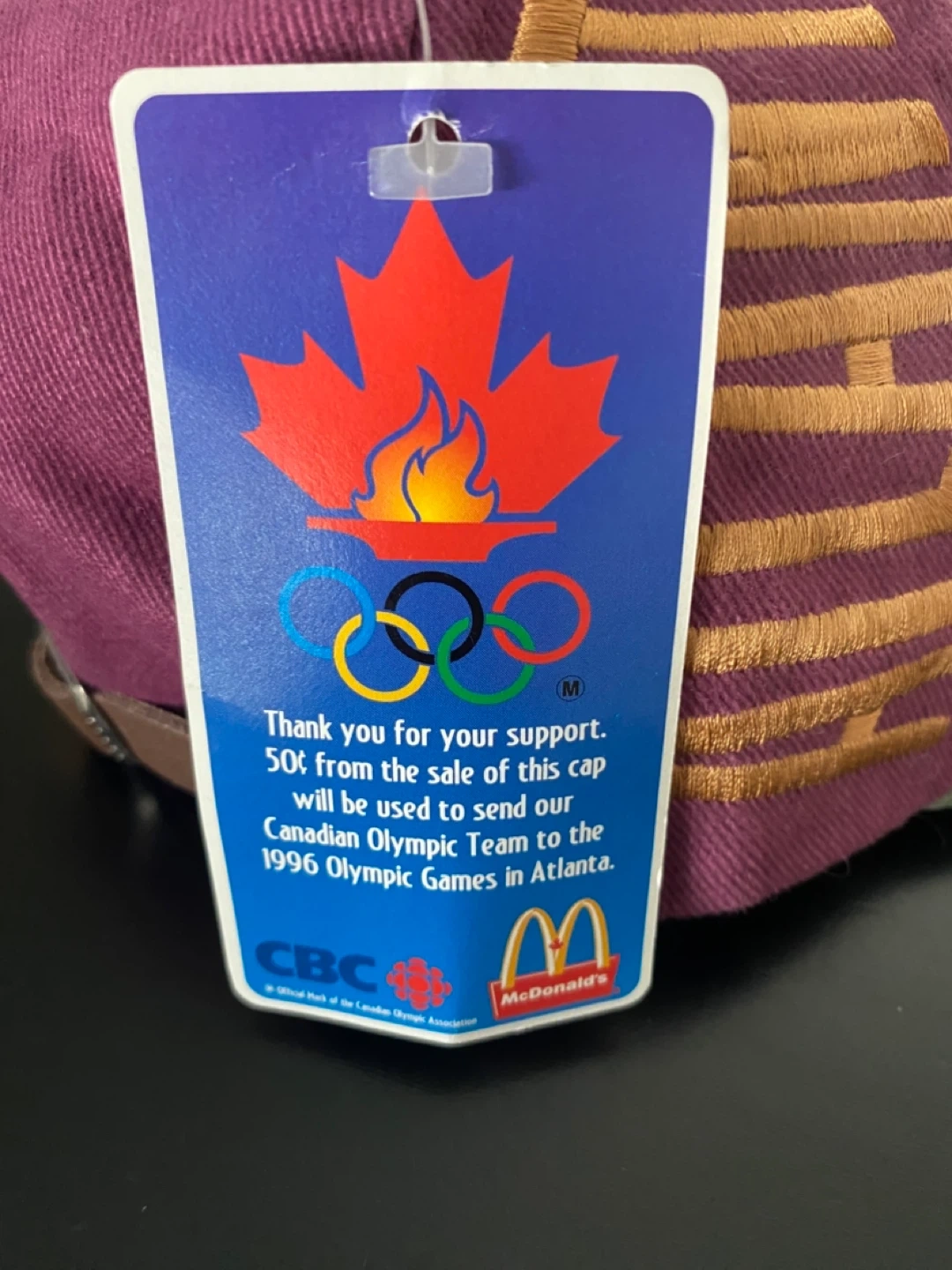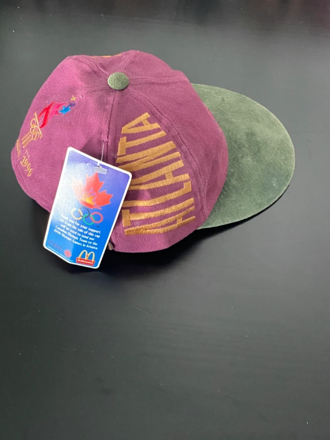 Selling a brand new Atlanta 1996 Olympics hat! This cap is a collaboration between McDonald's and CBC, celebrating the 1996 Olympic Summer Games in Atlanta. It has a unique design with the Olympic torch and the year embroidered on it. A portion of the proceeds from this hat went to support the Canadian Olympic Team to the 1996 Olympic Games. Adjustable leather strap, burgundy cap with green brim. Cash and pick up only, Cawthra and Lakeshore area in Mississauga.