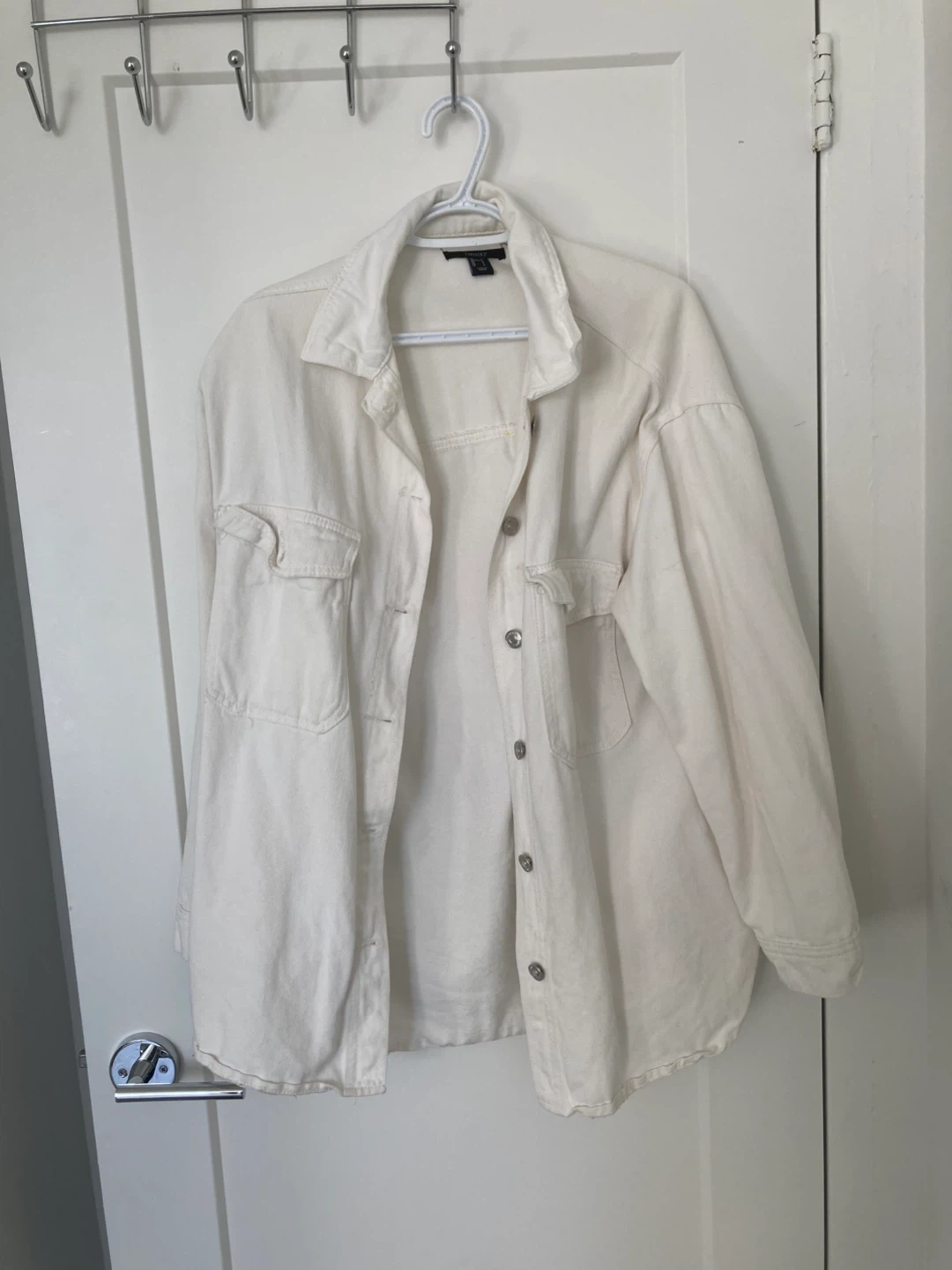 A cute tan denim jacket from Forever 21! The material is a light denim, perfect for layering. It's in great condition and ready for a new home