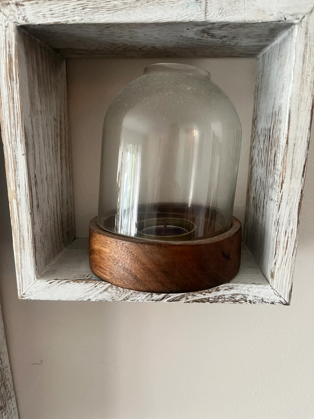 Selling a glass cloche with a wooden base. Had a tea light holder inside. I bought faulty so the glass won’t sit right in the base.