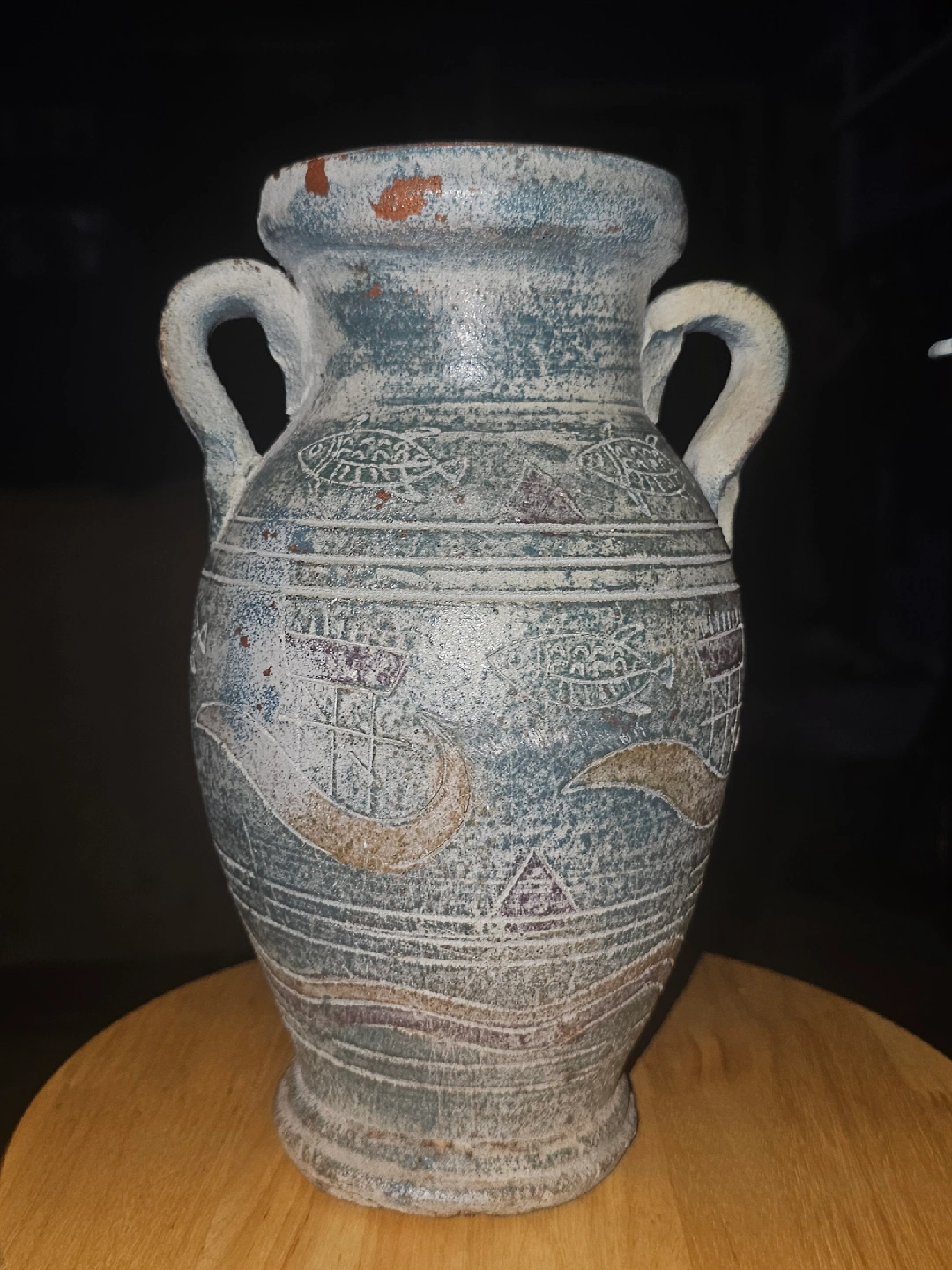 This is a unique decorative vase with two handles. It has a textured surface and a rustic look, featuring etched designs of turtles and geometric shapes. Perfect for adding a touch of character to any room!