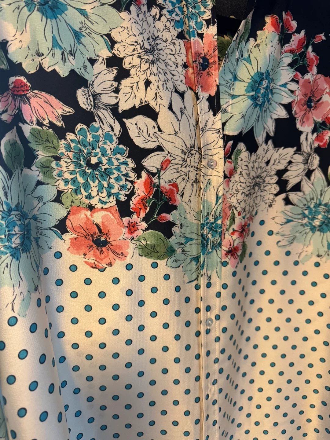 This blouse features a beautiful floral pattern on top and a polka dot design on the bottom. It's perfect for adding a pop of colour to your wardrobe! Brand new without tags Size Xs