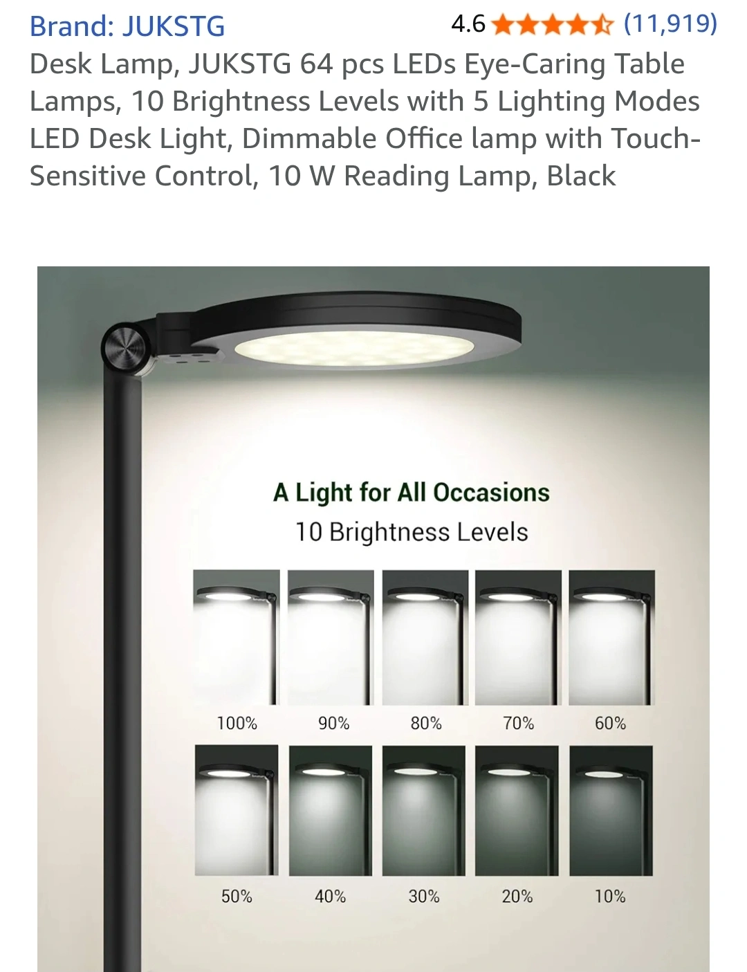 Selling a JUKSTG desk lamp in black. It features 64 LEDs and has multiple brightness levels and lighting modes. This eye-caring table lamp is dimmable with touch-sensitive control and is a 10W reading lamp. A great light for all occasions! (Open to offers below listed price)