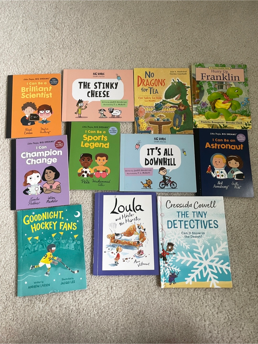 Selling a collection of children's picture books! Great for young readers. Titles include: - I Can Be a Brilliant Scientist - The Stinky Cheese - No Dragons for Tea - Hurry Up, Franklin - I Can Champion Change - I Can Be a Sports Legend - It's All Downhill - I Can Be an Astronaut - Goodnight, Hockey Fans - Loula and Mister the Monster - The Tiny Detectives