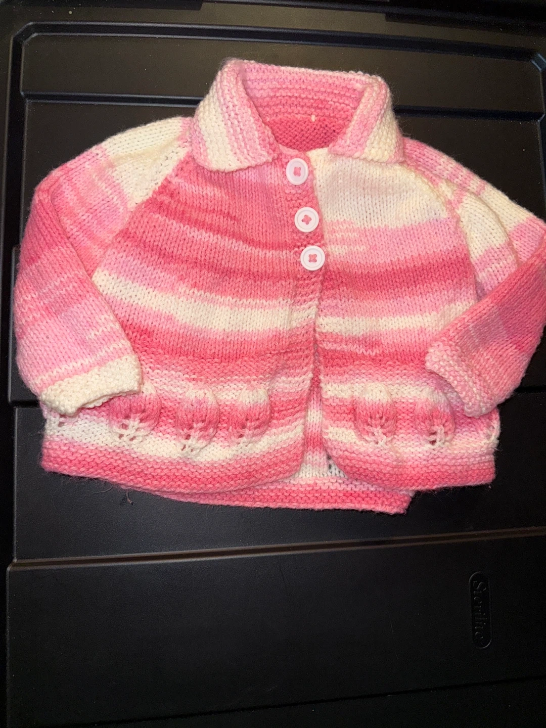A sweet little hand-knitted cardigan for your baby! It features a charming pink and white striped pattern, a classic collar, and cute little buttons. Perfect for keeping your little one cozy and stylish