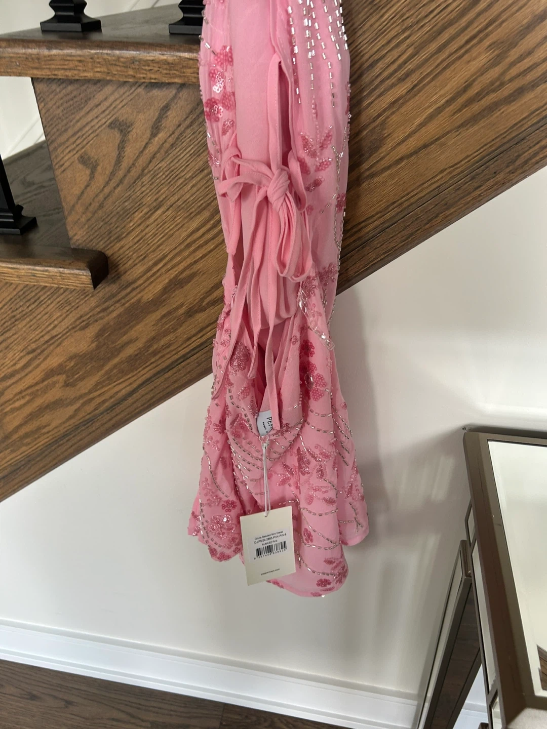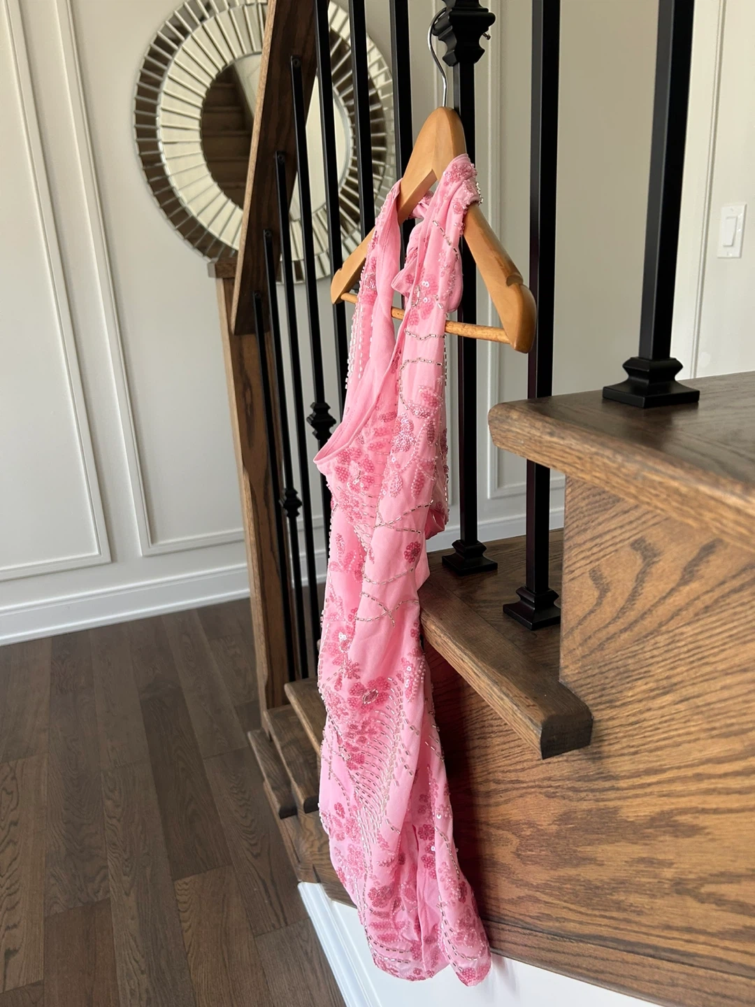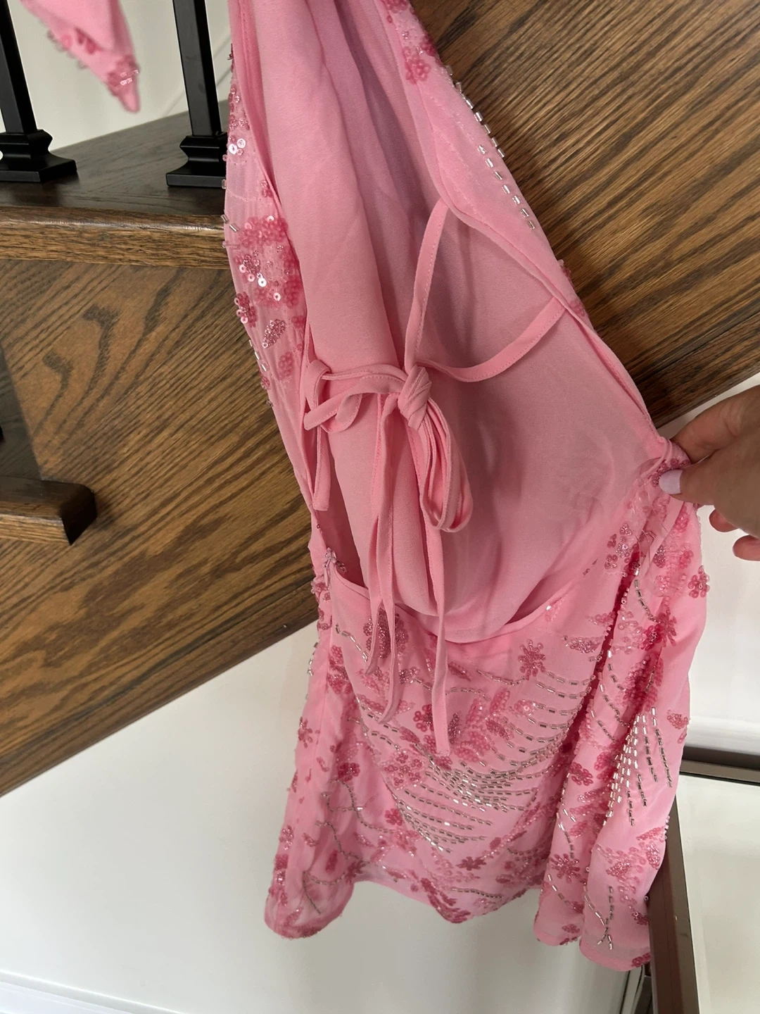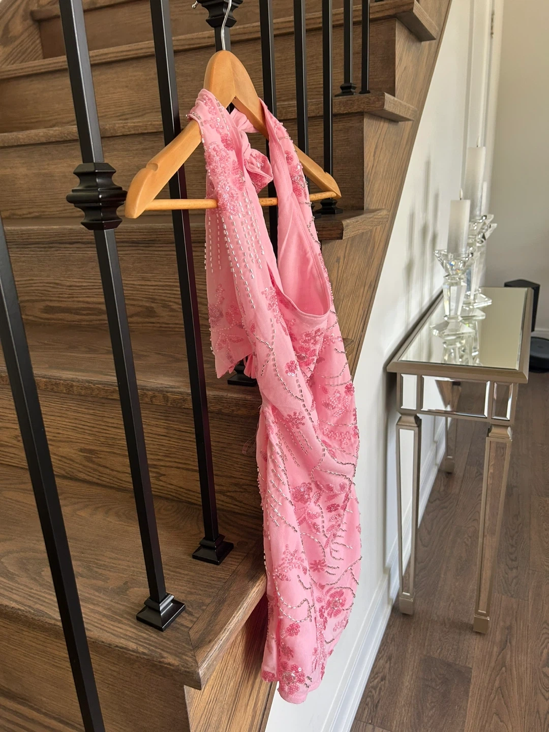 This is a beautiful pink halter dress, perfect for a special occasion! The dress features delicate beading and a flattering halter neckline.
