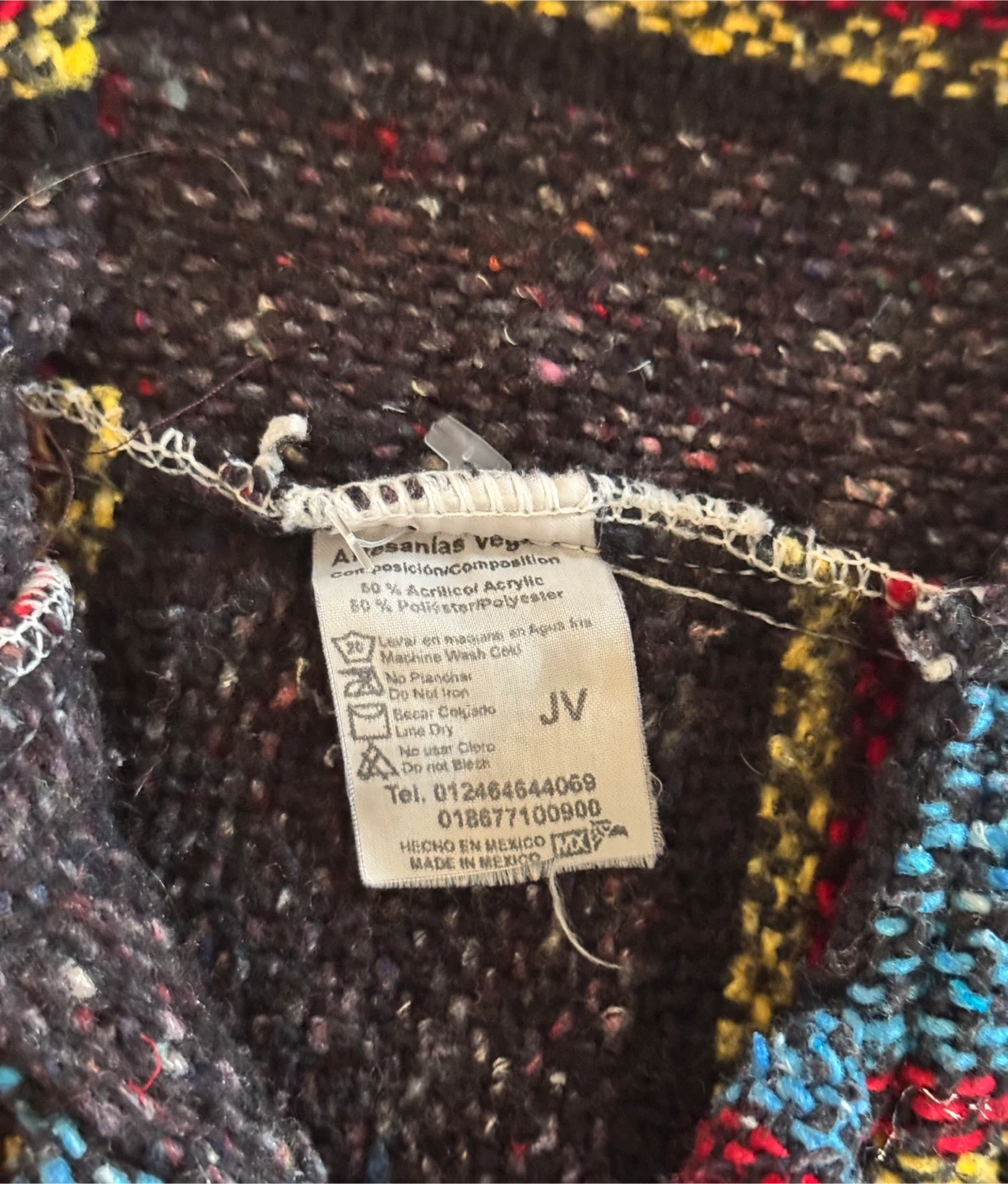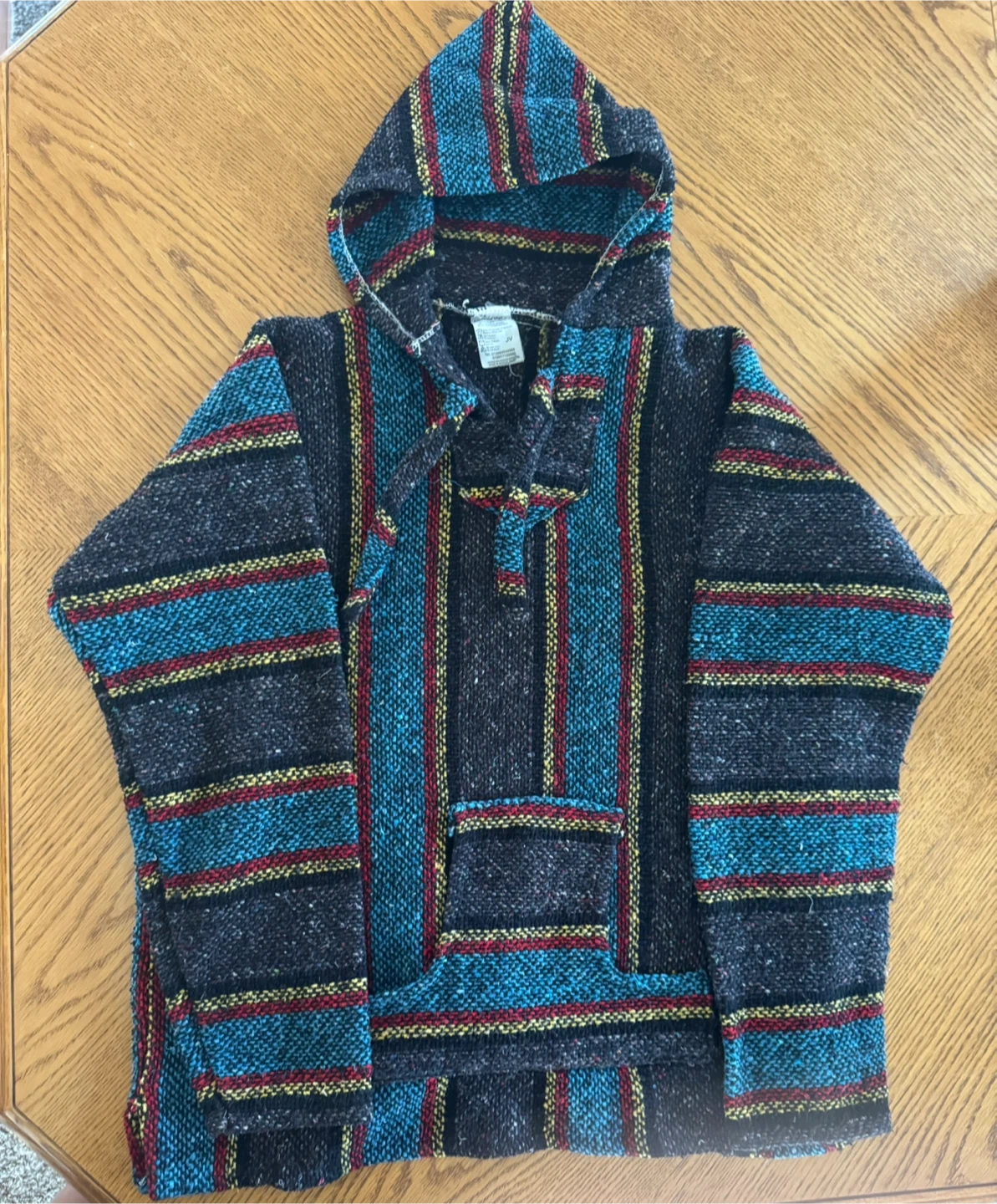 Cozy and colourful Baja hoodie! This hoodie is made of 50% acrylic and 50% polyester, perfect for keeping you warm on cooler days. It's a size medium and features a classic striped design with a front pocket. Machine washable for easy care!