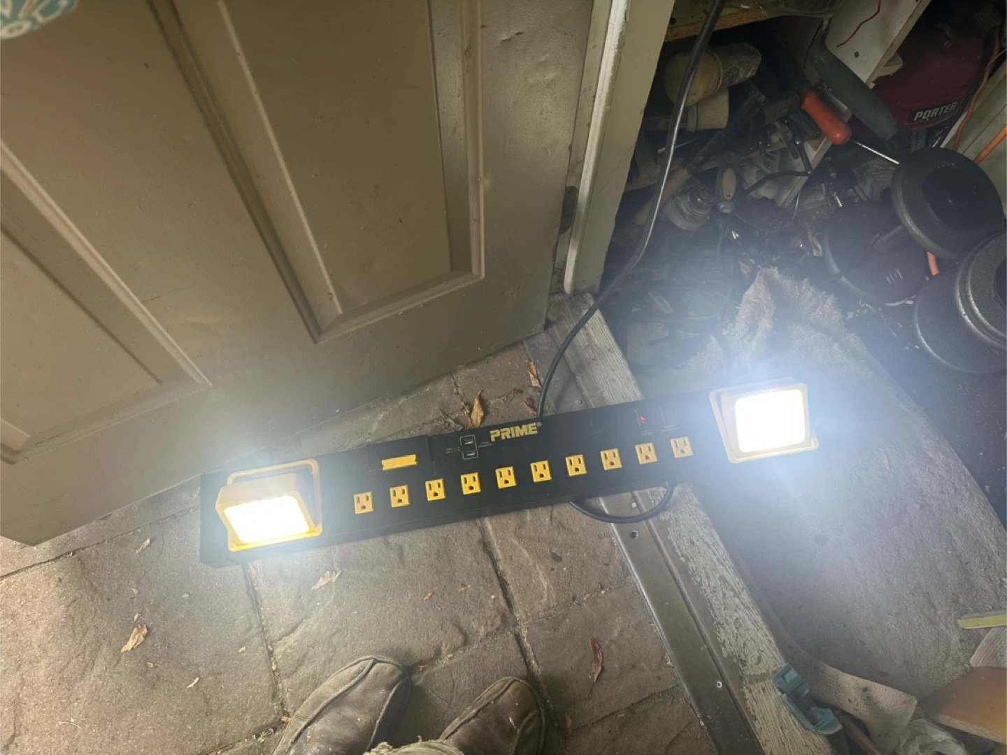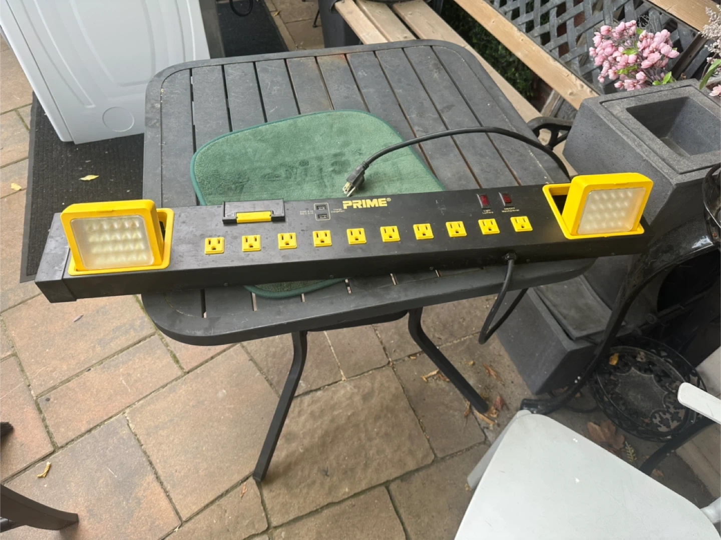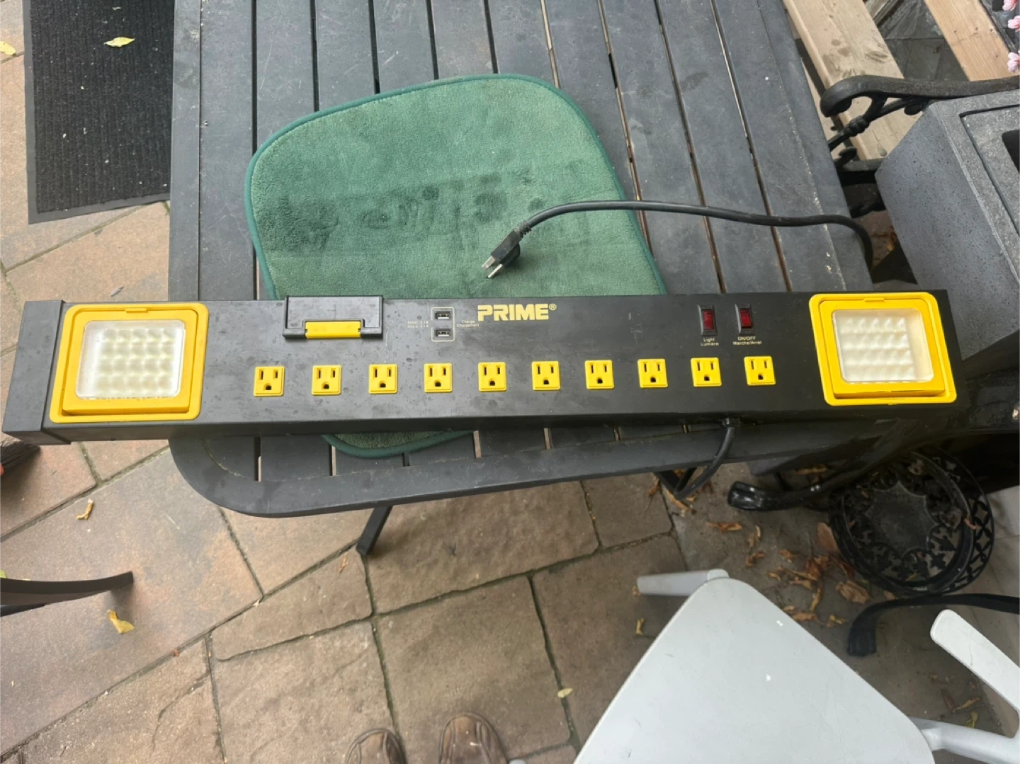Selling a PRIME power strip equipped with LED lights. It features multiple outlets and USB ports for convenient charging. Perfect for workshops, garages, or anywhere you need extra power and lighting!