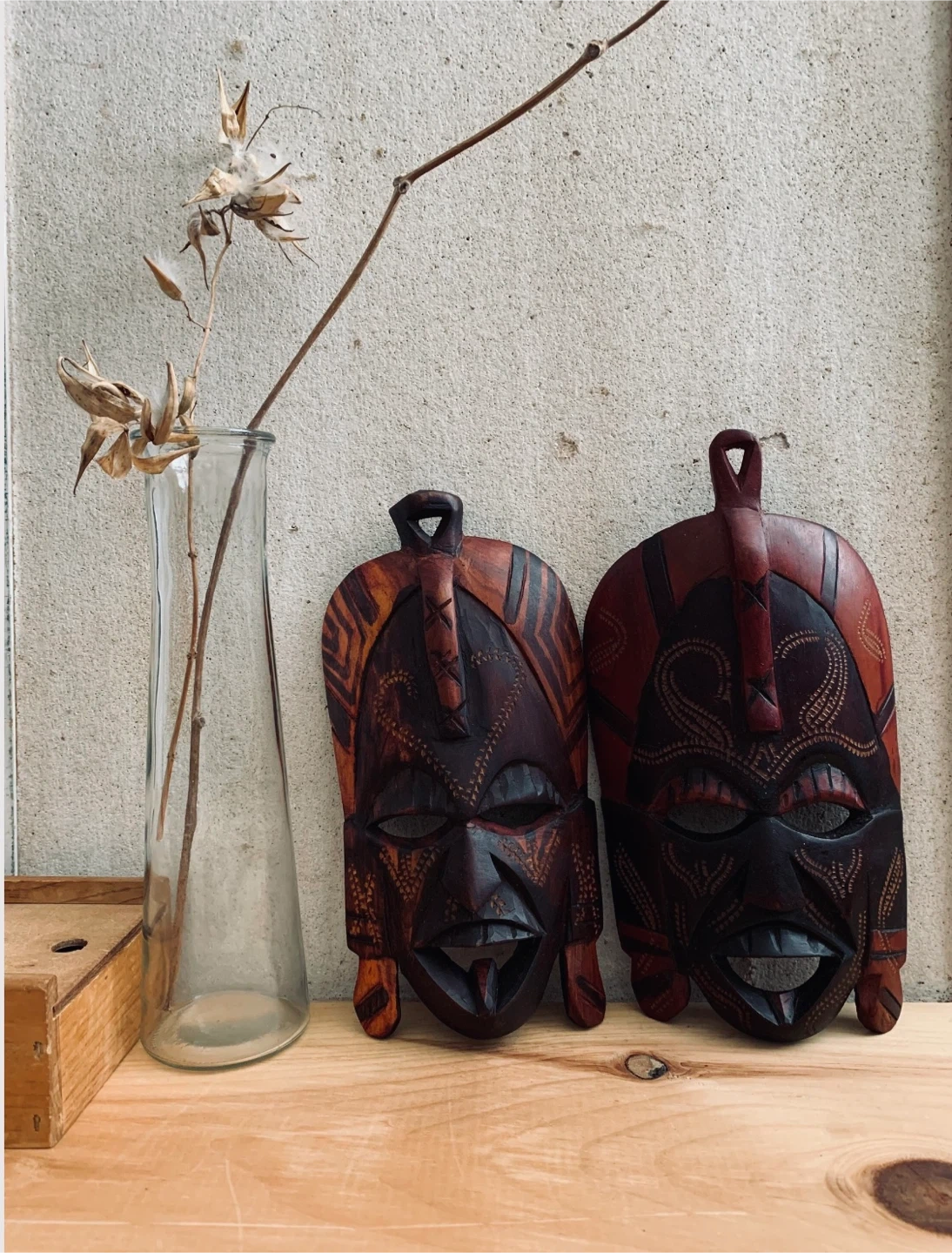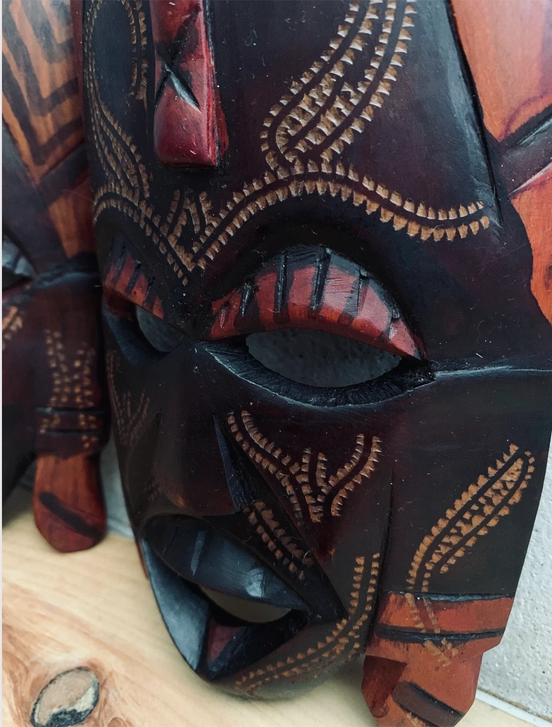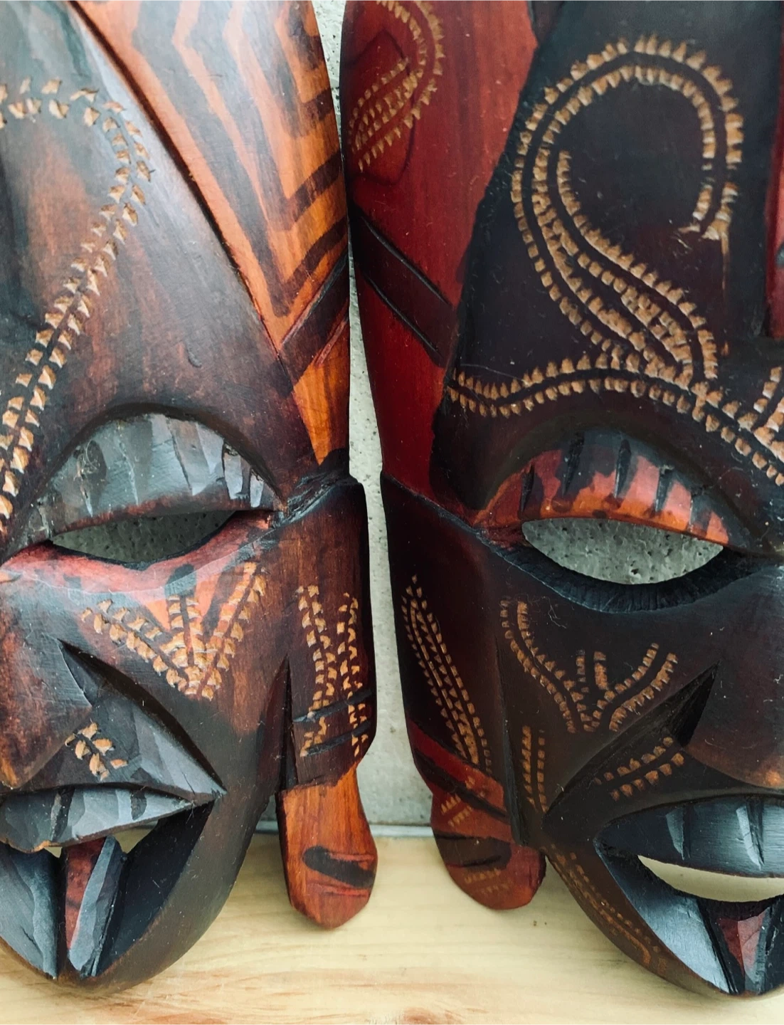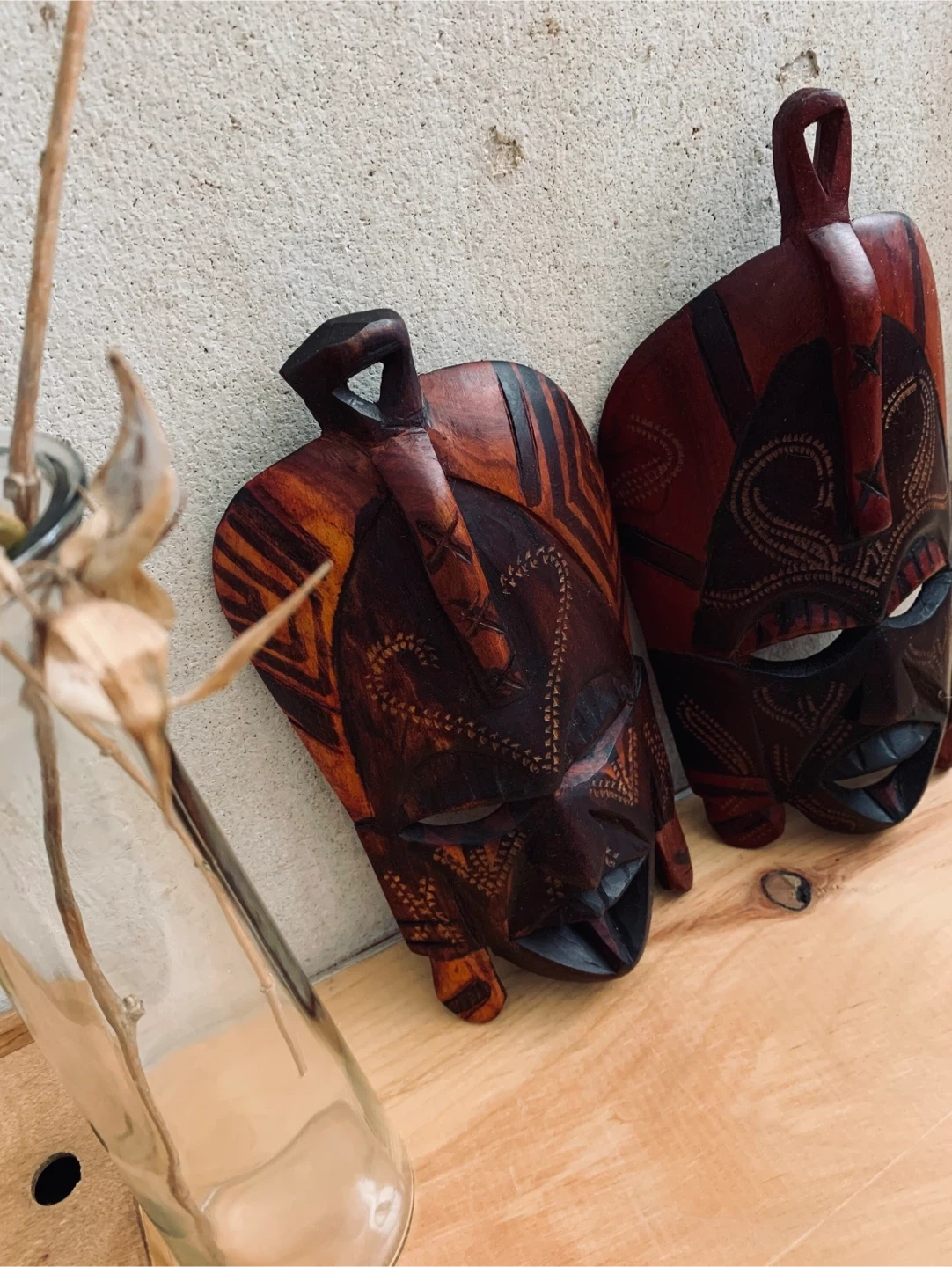 ➡️Cash & Pickup ONLY First come first serve Pair of African tribal masks in polished dark wood, featuring traditional facial carvings. Bold, eye-catching decor for any blank wall. Lightly worn vintage masks, overall excellent condition. MEASUREMENTS --------- Male (Bigger ) Height - 9.5 Inches Width - 4.75 Inches Female (Smaller) Height - 9.0 Inches Width - 4.25 Inches