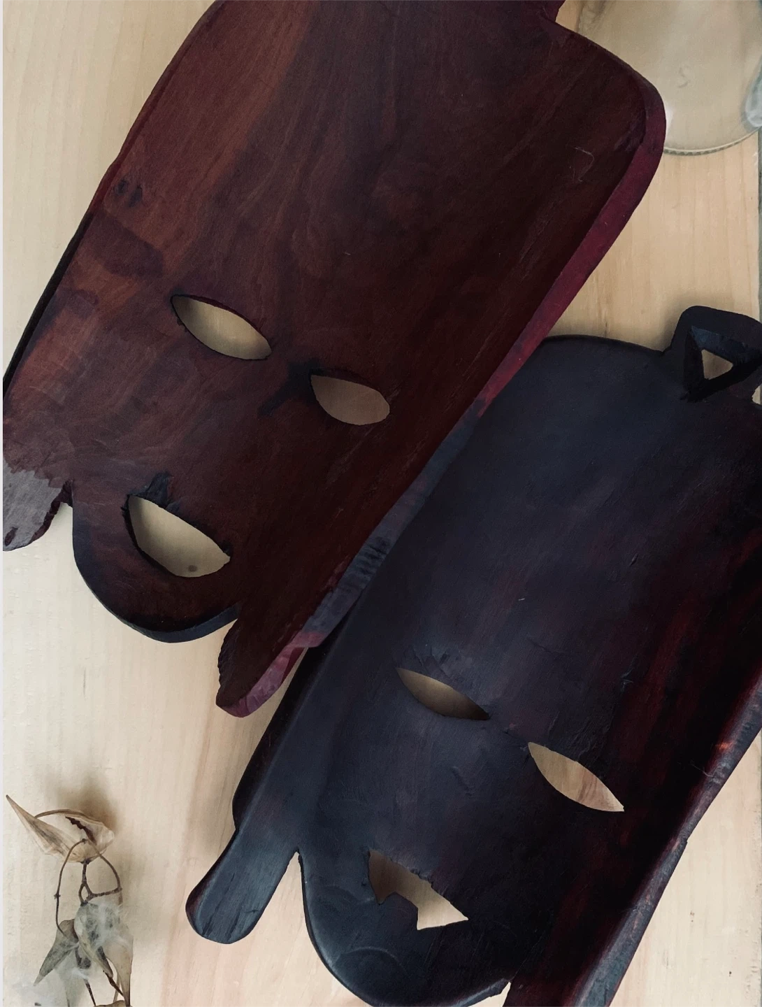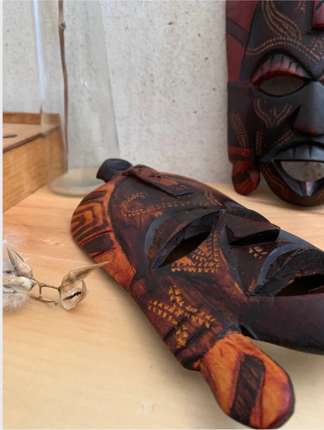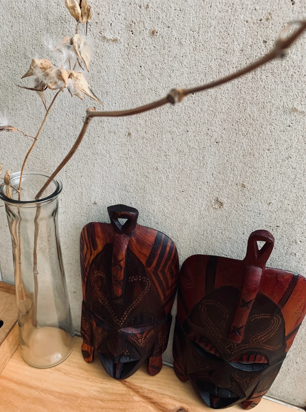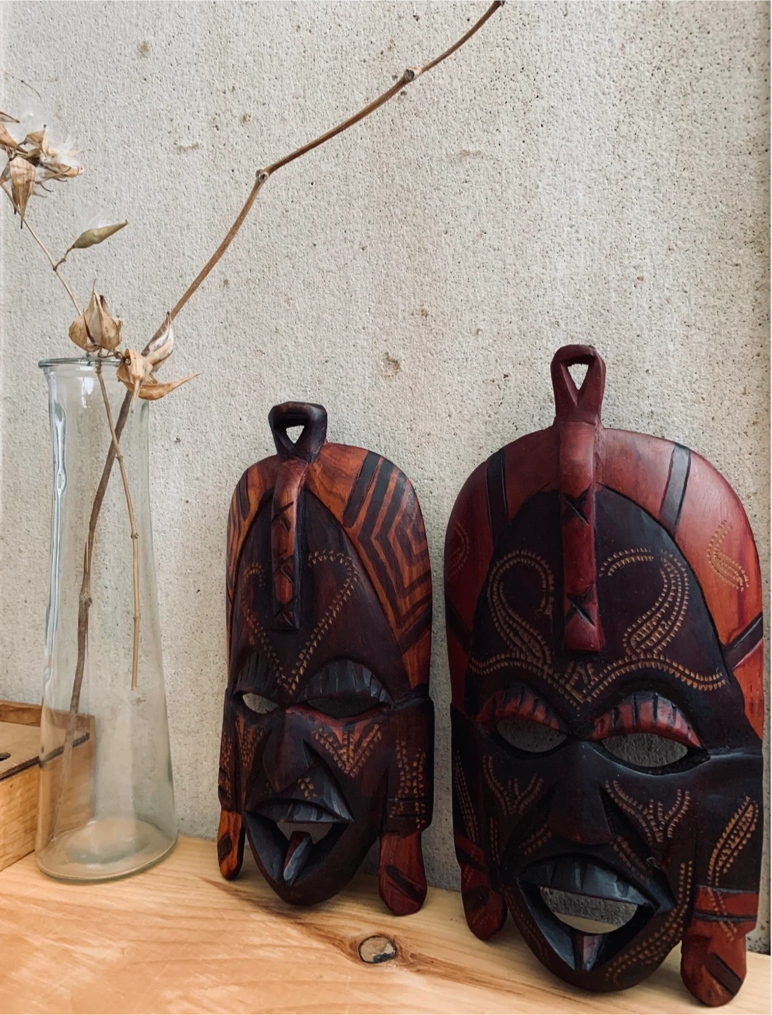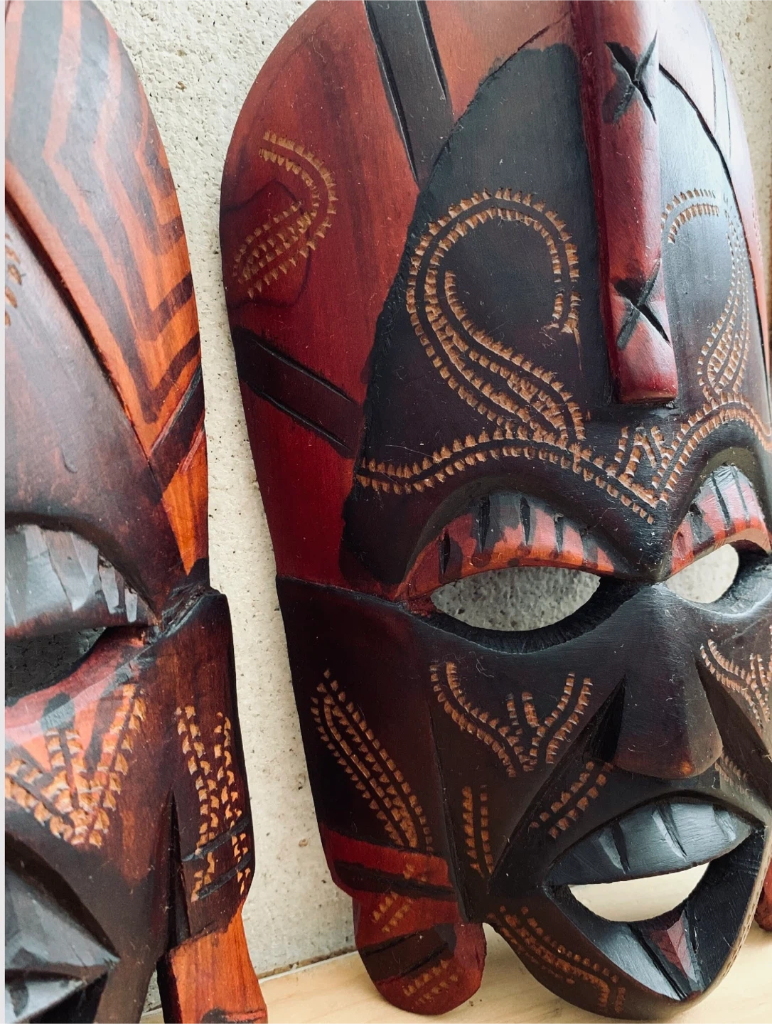 ➡️Cash & Pickup ONLY First come first serve Pair of African tribal masks in polished dark wood, featuring traditional facial carvings. Bold, eye-catching decor for any blank wall. Lightly worn vintage masks, overall excellent condition. MEASUREMENTS --------- Male (Bigger ) Height - 9.5 Inches Width - 4.75 Inches Female (Smaller) Height - 9.0 Inches Width - 4.25 Inches
