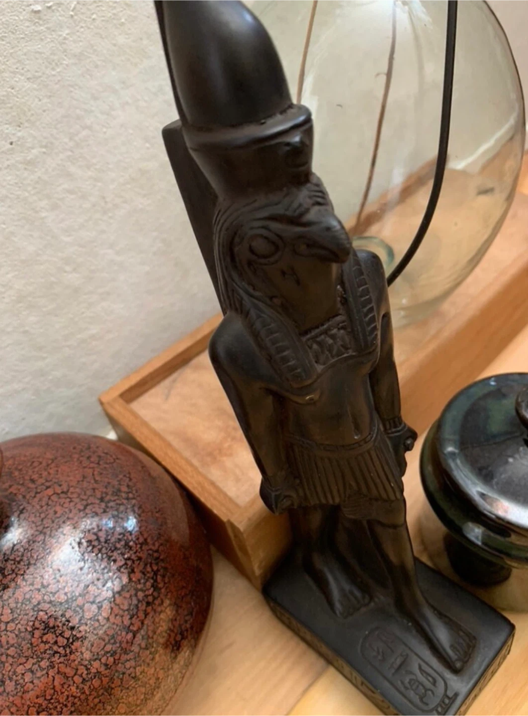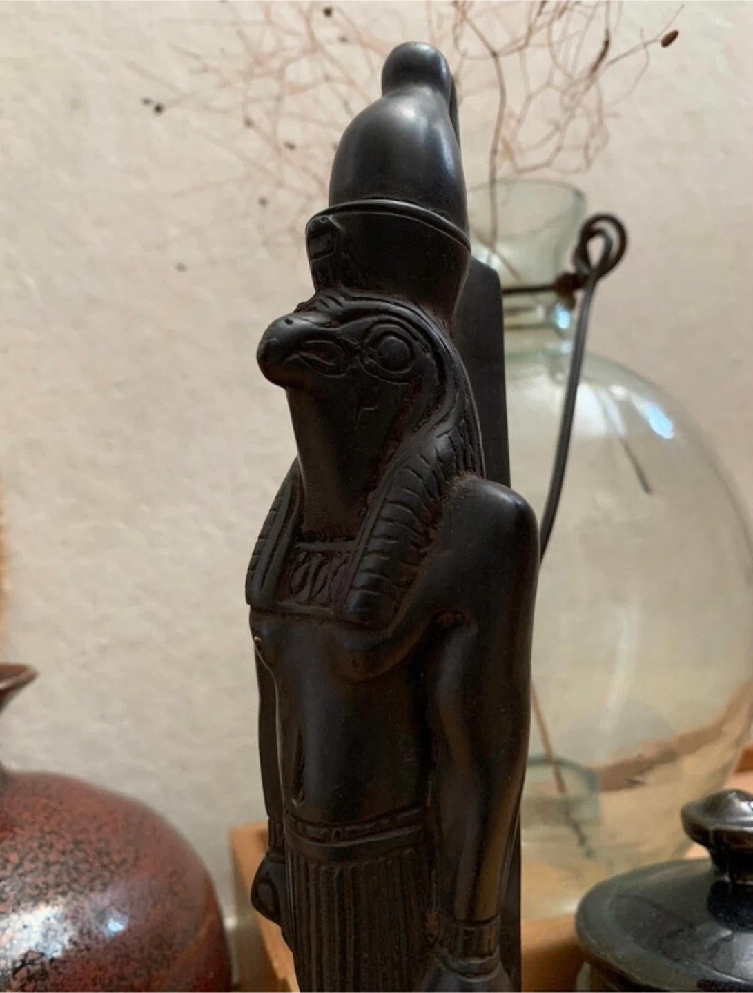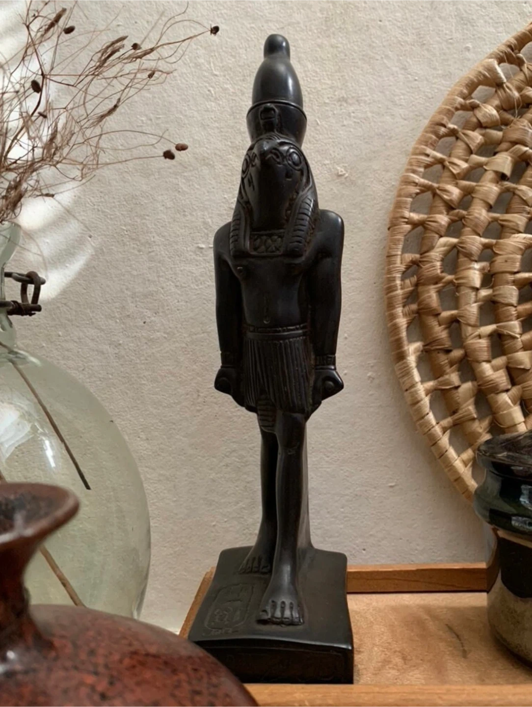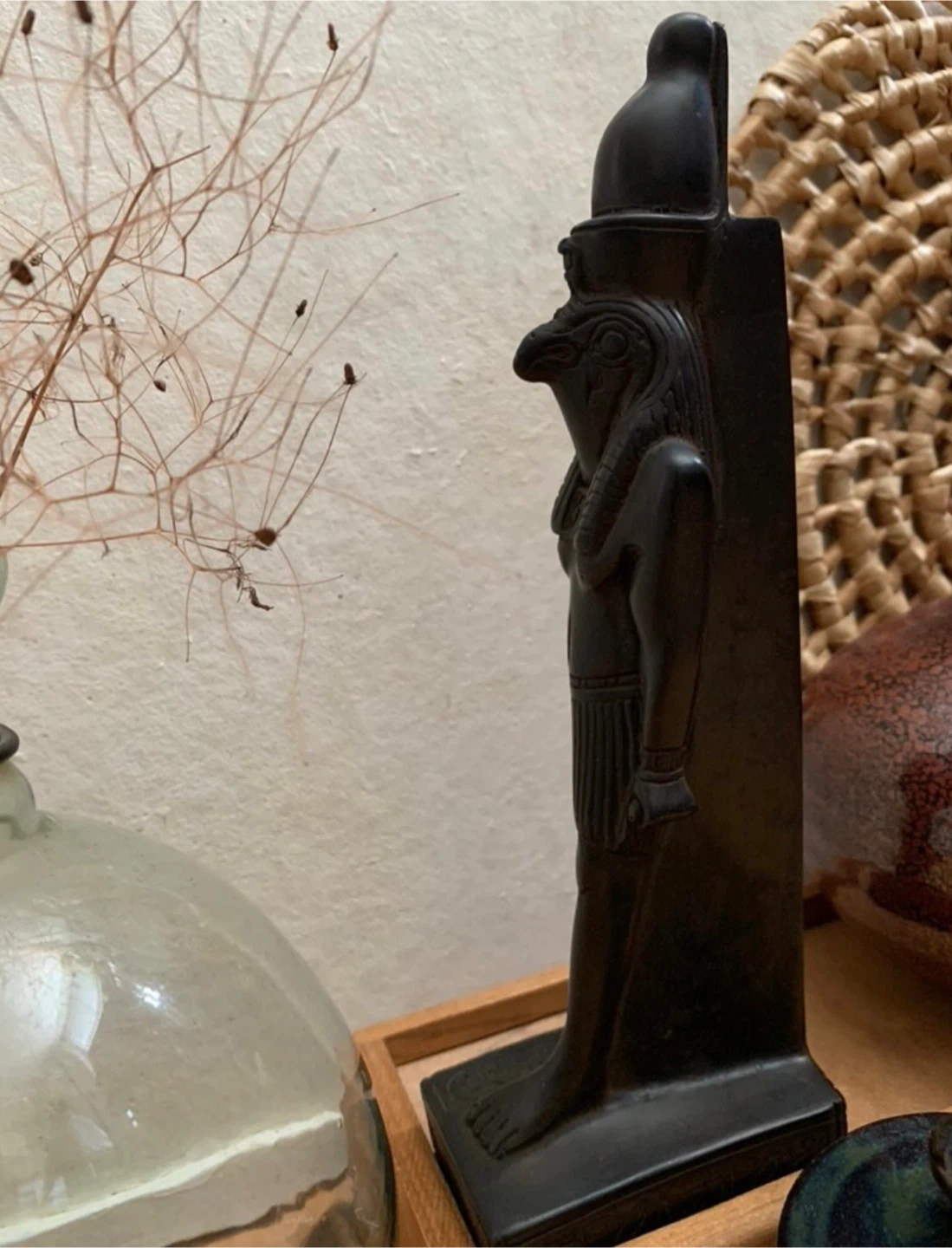 ➡️Cash & Pickup ONLY First come first serve Vintage Statue of Horus – Falcon God of Egypt Crafted in solid polystone, this hand-carved figure represents Horus, the revered sky deity whose eyes symbolized the sun and moon. The item is in good condition DIMENSIONS Height - 9 inches Width - 2 inches Depth - 3 inches