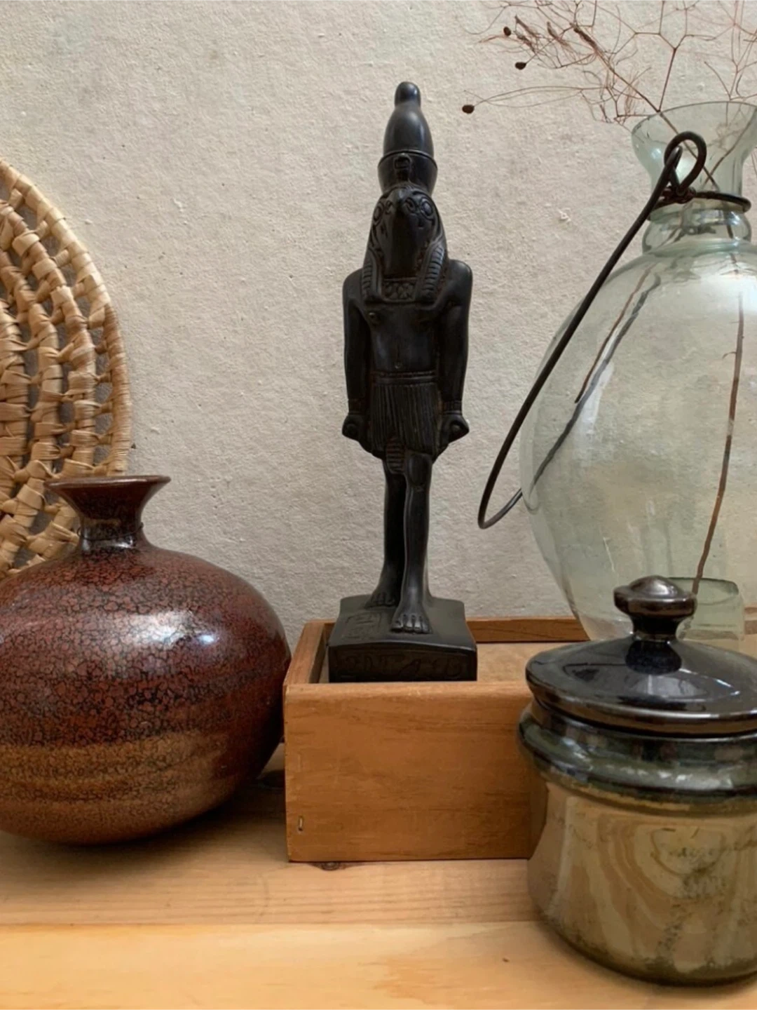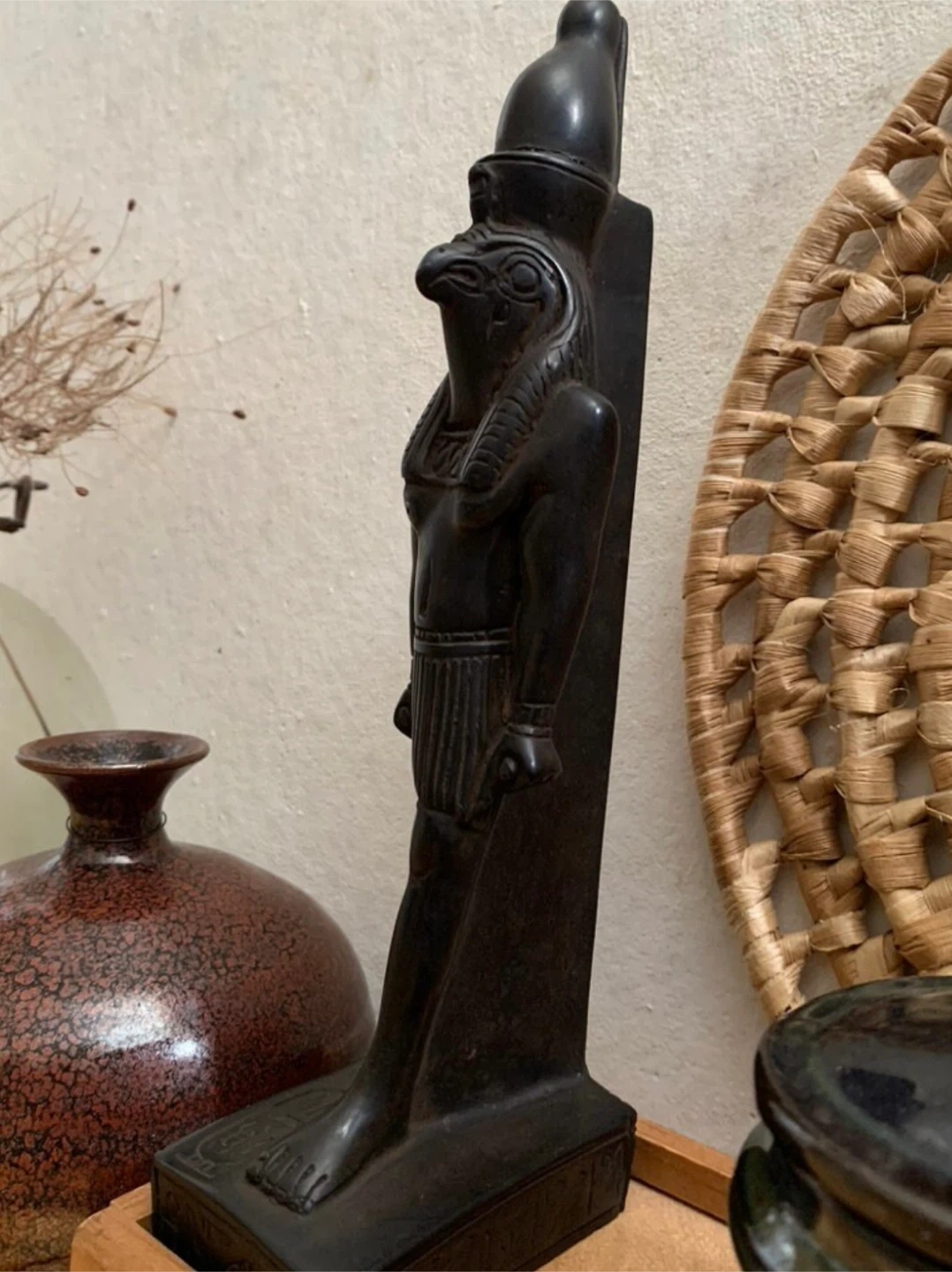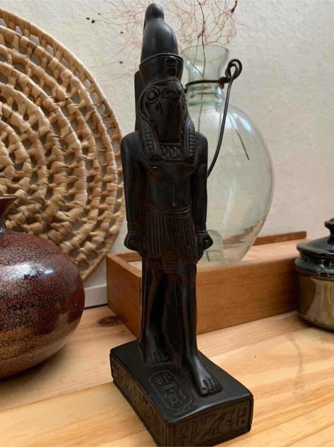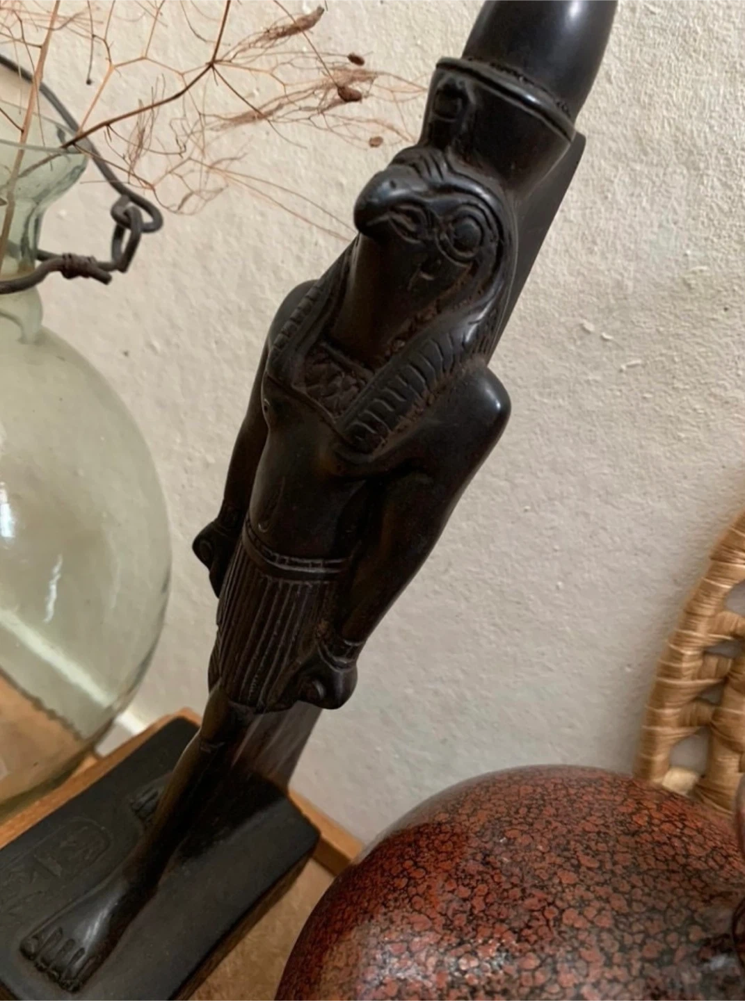 ➡️Cash & Pickup ONLY First come first serve Vintage Statue of Horus – Falcon God of Egypt Crafted in solid polystone, this hand-carved figure represents Horus, the revered sky deity whose eyes symbolized the sun and moon. The item is in good condition DIMENSIONS Height - 9 inches Width - 2 inches Depth - 3 inches