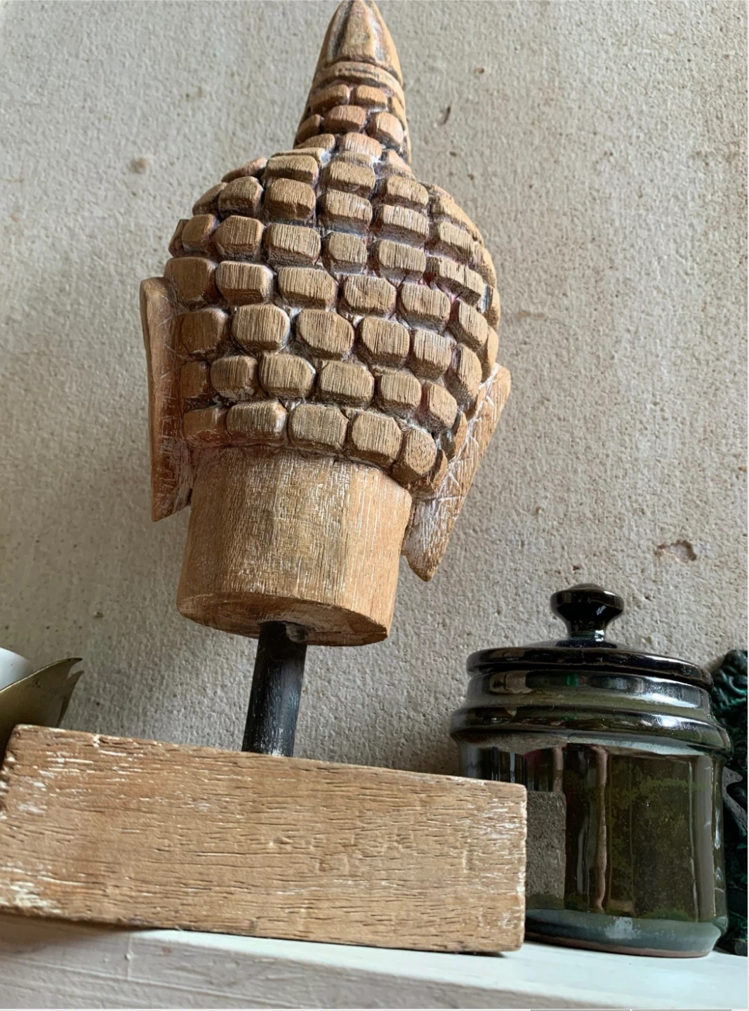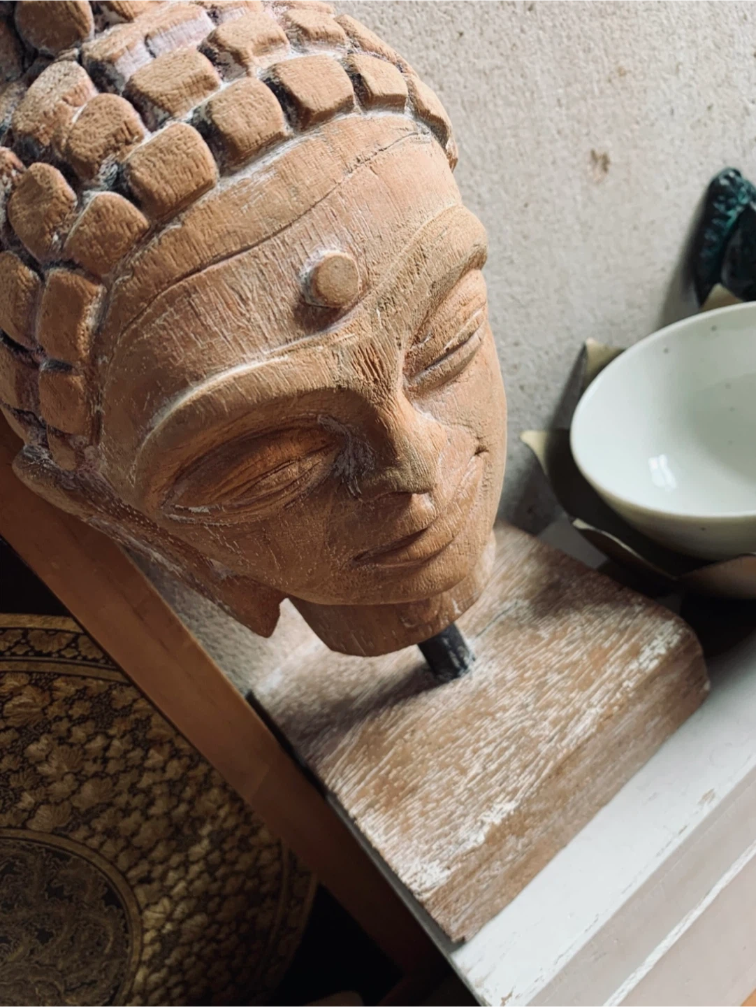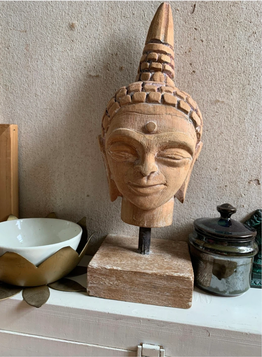 ➡️Cash & Pickup ONLY First come first serve Vintage Buddha Head Statue with a peaceful smile. This wooden Buddha brings calm to any space, perfect for yoga, meditation, or quiet reflection.It's in great condition and ready to add a touch of zen to your home. The Statue is in good vintage condition. DIMENSIONS Total Height - 12 inches (From Base) Height of the Head - 9.5 inches Width - 4. 5 inches