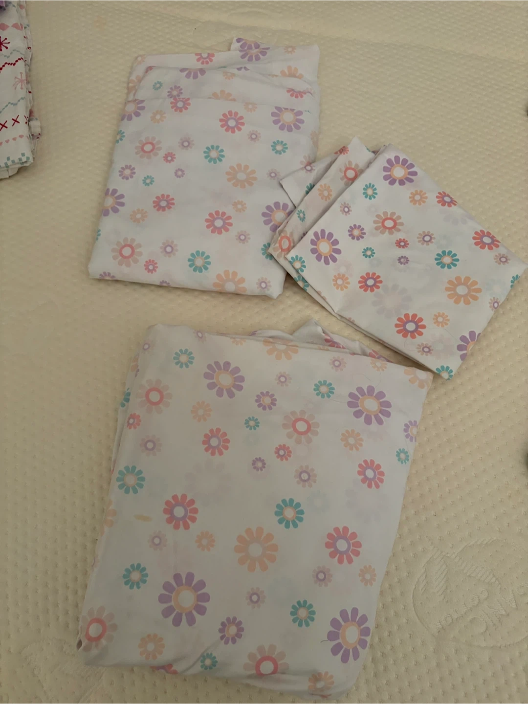 100% polyester. 1 pillowcase, 1 fitted sheet, 1 flat sheet. Pick up in the Beaches at Queen and Victoria Park.